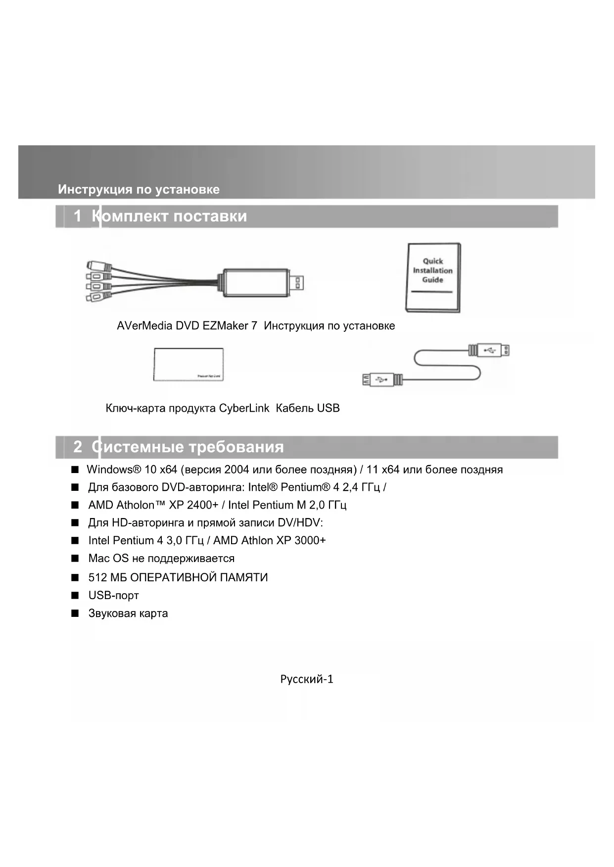 Ключ-карта продукта CyberLink Кабель USB 2 Системные требования Windows® 10 x64 (версия 2004 или более поздняя) / 11 x64 или более поздняя Для базового DVD-авторинга: Intel® Pentium® 4 2,4 ГГц / AMD Atholon™ XP 2400+ / Intel Pentium M 2,0 ГГц Для HD-авторинга и прямой записи DV/HDV: Intel Pentium 4 3,0 ГГц / AMD Athlon XP 3000+ Mac OS не поддерживается 512 МБ ОПЕРАТИВНОЙ ПАМЯТИ USB-порт Звуковая картаPусский-2 3 Установка оборудования Подключение устройства AVerMedia DVD EZMaker 7 Для подключения устройства AVerMedia DVD EZMaker 7 воспользуйтесь нижеприведенной схемой. Для записи видео со звуком необходимо указать входной источник аудио и убедиться, что звук не выключен, и уровень громкости достаточен. Для этого дважды кликните по желтой иконке регулировки громкости динамиков на панели задач или нажмите Пуск и выберите Программы > Стандартные > Развлечения > Громкость. Для получения более подробной информации обратитесь к разделу "Регулятор громкости" справки по операционной системе. Example: Camcorder VCR AV Output Port RCA Cable (not supplied) RCA Cable (not supplied) RCA Cable (not supplied) S-Video Cable (not supplied) (Yellow) (Red) (White) USB Cable USB Port ComputerИнструкция по установке Pусский-3 4 Установка драйвера После установки AVerMedia DVD EZMaker 7 включите компьютер. Система автоматически определит новое устройство при первой загрузке компьютера. Просто пропустите мастер и загрузите последнюю версию драйвера с веб-сайта нашей