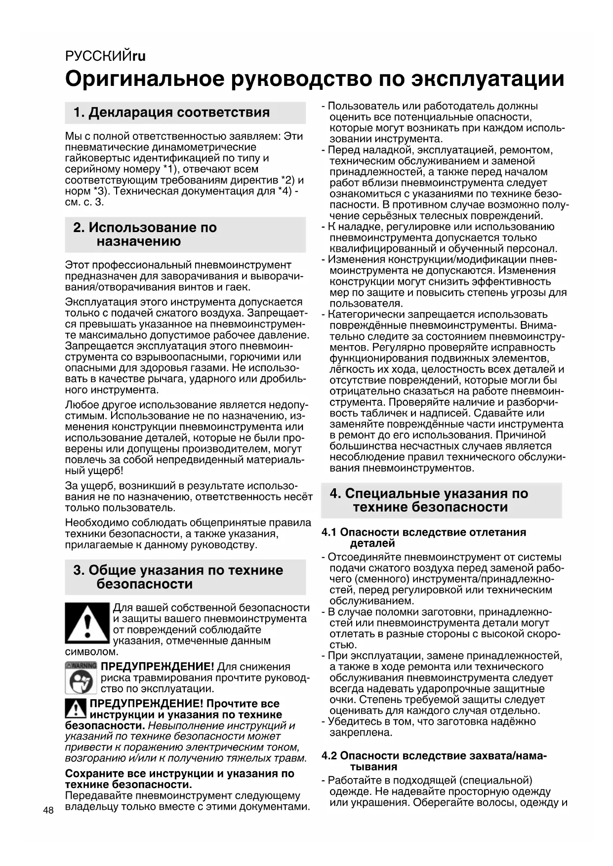 ПРЕДУПРЕЖДЕНИЕ! Для снижения риска травмирования прочтите руковод- ство по эксплуатации. ПРЕДУПРЕЖДЕНИЕ! Прочтите все инструкции и указания по технике безопасности. Невыполнение инструкций и указаний по технике безопасности может привести к поражению электрическим током, возгоранию и/или к получению тяжелых травм. Сохраните все инструкции и указания по технике безопасности. Передавайте пневмоинструмент следующему владельцу только вместе с этими документами. - Пользователь или работодатель должны оценить все потенциальные опасности, которые могут возникать при каждом исполь- зовании инструмента. - Перед наладкой, эксплуатацией, ремонтом, техническим обслуживанием и заменой принадлежностей, а также перед началом работ вблизи пневмоинструмента следует ознакомиться с указаниями по технике безо- пасности. В противном случае возможно полу- чение серьёзных телесных повреждений. - К наладке, регулировке или использованию пневмоинструмента допускается только квалифицированный и обученный персонал. - Изменения конструкции/модификации пнев- моинструмента не допускаются. Изменения конструкции могут снизить эффективность мер по защите и повысить степень угрозы для пользователя. - Категорически запрещается использовать повреждённые пневмоинструменты. Внима- тельно следите за состоянием пневмоинстру- ментов. Регулярно проверяйте исправность функционирования подвижных элементов, лёгкость их хода, целостность всех деталей и отсутствие повреждений, которые могли бы отрицательно сказаться на работе пневмоин- струмента. Проверяйте наличие и разборчи- вость табличек и надписей. Сдавайте или заменяйте повреждённые части инструмента в ремонт до его использования. Причиной большинства несчастных случаев является несоблюдение правил технического обслужи- вания пневмоинструментов.