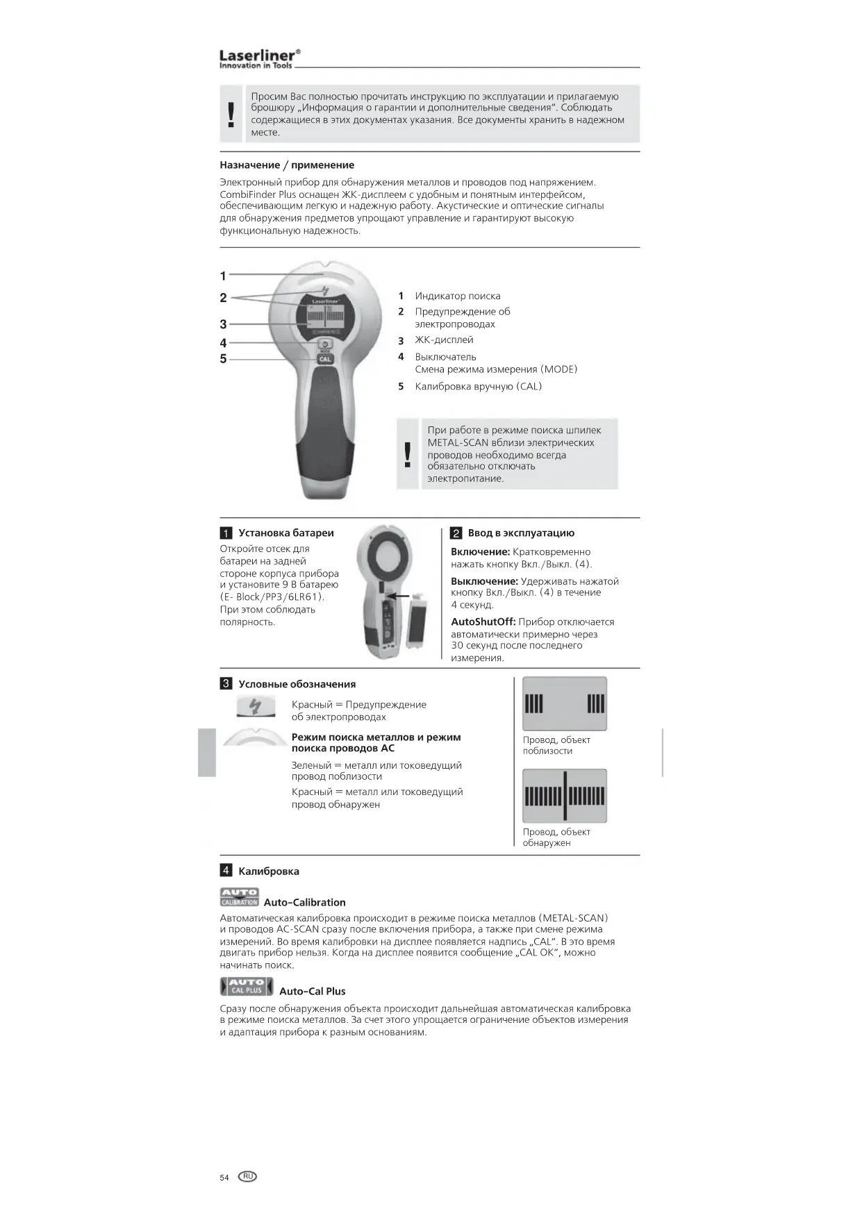 Электронный прибор для обнаружения металлов и проводов под напряжением. CombiFinder Plus оснащен ЖК-дисплеем с удобным и понятным интерфейсом, обеспечивающим легкую и надежную работу. Акустические и оптические сигналы для обнаружения предметов упрощают управление и гарантируют высокую функциональную надежность. Откройте отсек для батареи на задней стороне корпуса прибора и установите 9 В батарею (E- Block/PP3/6LR61). При этом соблюдать полярность. Установка батареи Включение: Кратковременно нажать кнопку Вкл./Выкл. (4). Выключение: Удерживать нажатой кнопку Вкл./Выкл. (4) в течение 4 секунд. AutoShutOff: Прибор отключается автоматически примерно через 30 секунд после последнего