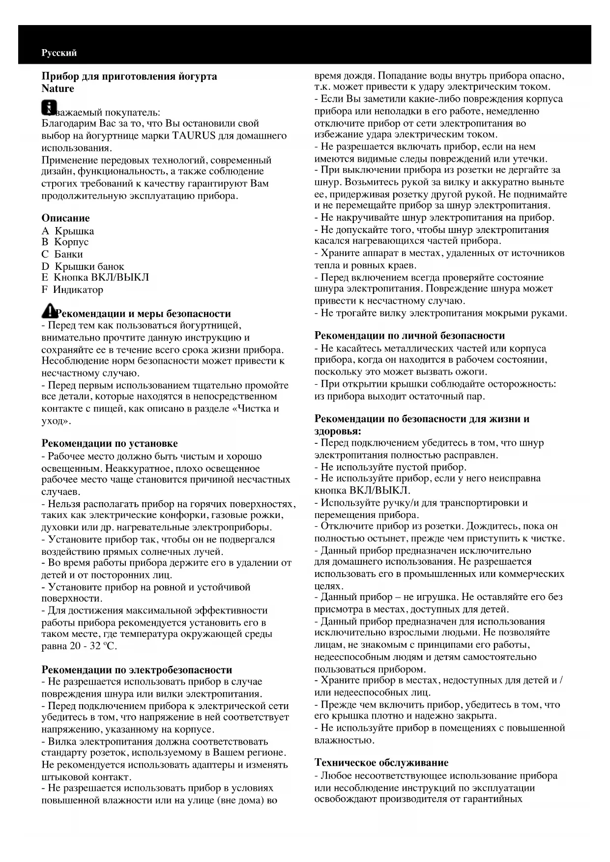 A Крышка B Корпус C Банки D Крышки банок E Кнопка ВКЛ/ВЫКЛ F Индикатор Рекомендацииимерыбезопасности - Перед тем как пользоваться йогуртницей, внимательно прочтите данную инструкцию и сохраняйте ее в течение всего срока жизни прибора. Несоблюдение норм безопасности может привести к несчастному случаю. - Перед первым использованием тщательно промойте все детали, которые находятся в непосредственном контакте с пищей, как описано в разделе «Чистка и