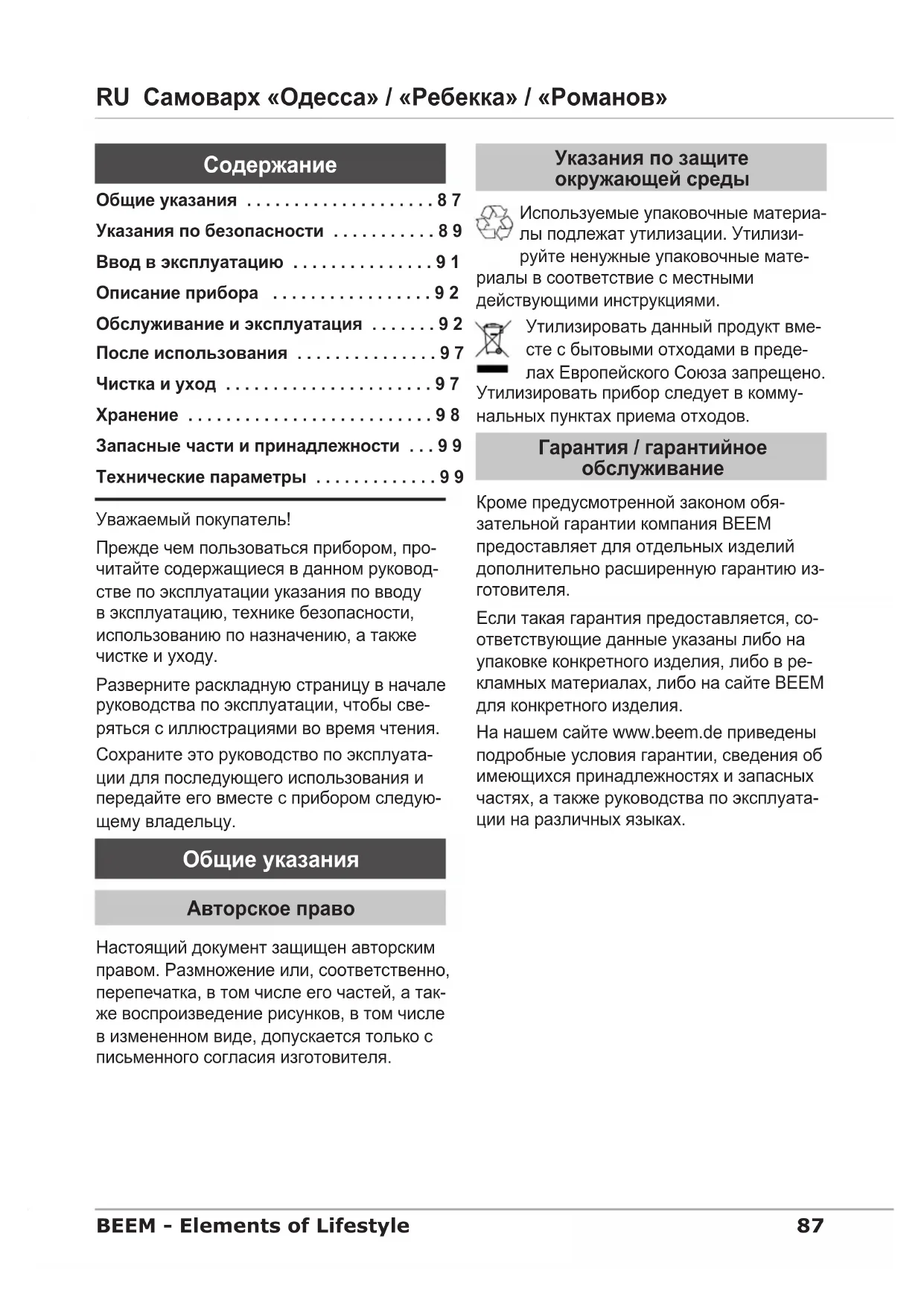 в случае выявления неисправности – при эксплуатации прибора, перед чисткой прибора. – Опасность удушения! Упаковочные материалы нельзя ► использовать для игр. Существует опасность удушения.90 Самоварx «Одесса» / «Ребекка» / «Романов» RU BEEM - Elements of Lifestyle ПРЕДУПРЕЖДЕНИЕ Ни в коем случае не нагревайте ► в приборе другие жидкости кроме