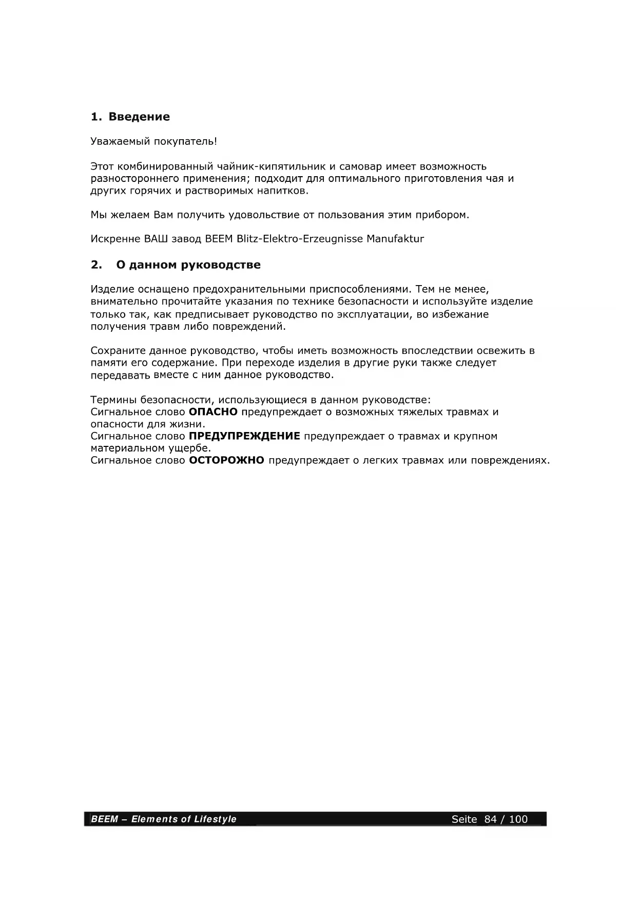 вместе с ним данное руководство. Термины безопасности, использующиеся в данном руководстве: Сигнальное слово ОПАСНО предупреждает о возможных тяжелых травмах и опасности для жизни. Сигнальное слово ПРЕДУПРЕЖДЕНИЕ предупреждает о травмах и крупном материальном ущербе. Сигнальное слово ОСТОРОЖНО предупреждает о легких травмах или повреждениях.BEEM – Elements of Lifestyle Seite 85 / 100