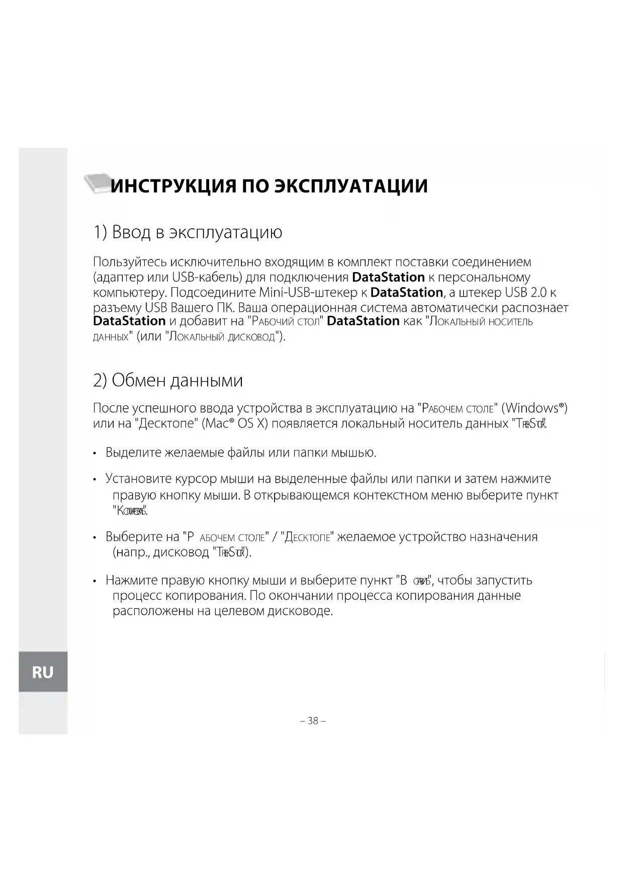 Пользуйтесь исключительно входящим в комплект поставки соединением (адаптер или USB-кабель) для подключения DataStation к персональному компьютеру. Подсоедините Mini-USB-штекер к DataStation, а штекер USB 2.0 к разъему USB Вашего ПК. Ваша операционная система автоматически распознает DataStation и добавит на "Р а б о ч и й с т о л " DataStation как "ло к а л ь н ы й н о с и т е л ь д а н н ы х " (или "ло к а л ь н ы й д и с к о в о д ").