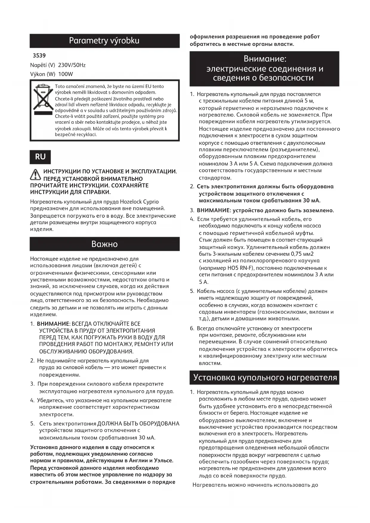 ИНСТРУКЦИИ ПО УСТАНОВКЕ И ЭКСПЛУАТАЦИИ. ПЕРЕД УСТАНОВКОЙ ВНИМАТЕЛЬНО ПРОЧИТАЙТЕ ИНСТРУКЦИИ. СОХРАНЯЙТЕ ИНСТРУКЦИИ ДЛЯ СПРАВКИ. Нагреватель купольный для пруда Hozelock Cyprio предназначен для использования вне помещений. Запрещается погружать его в воду. Все электрические детали размещены внутри защищенного корпуса