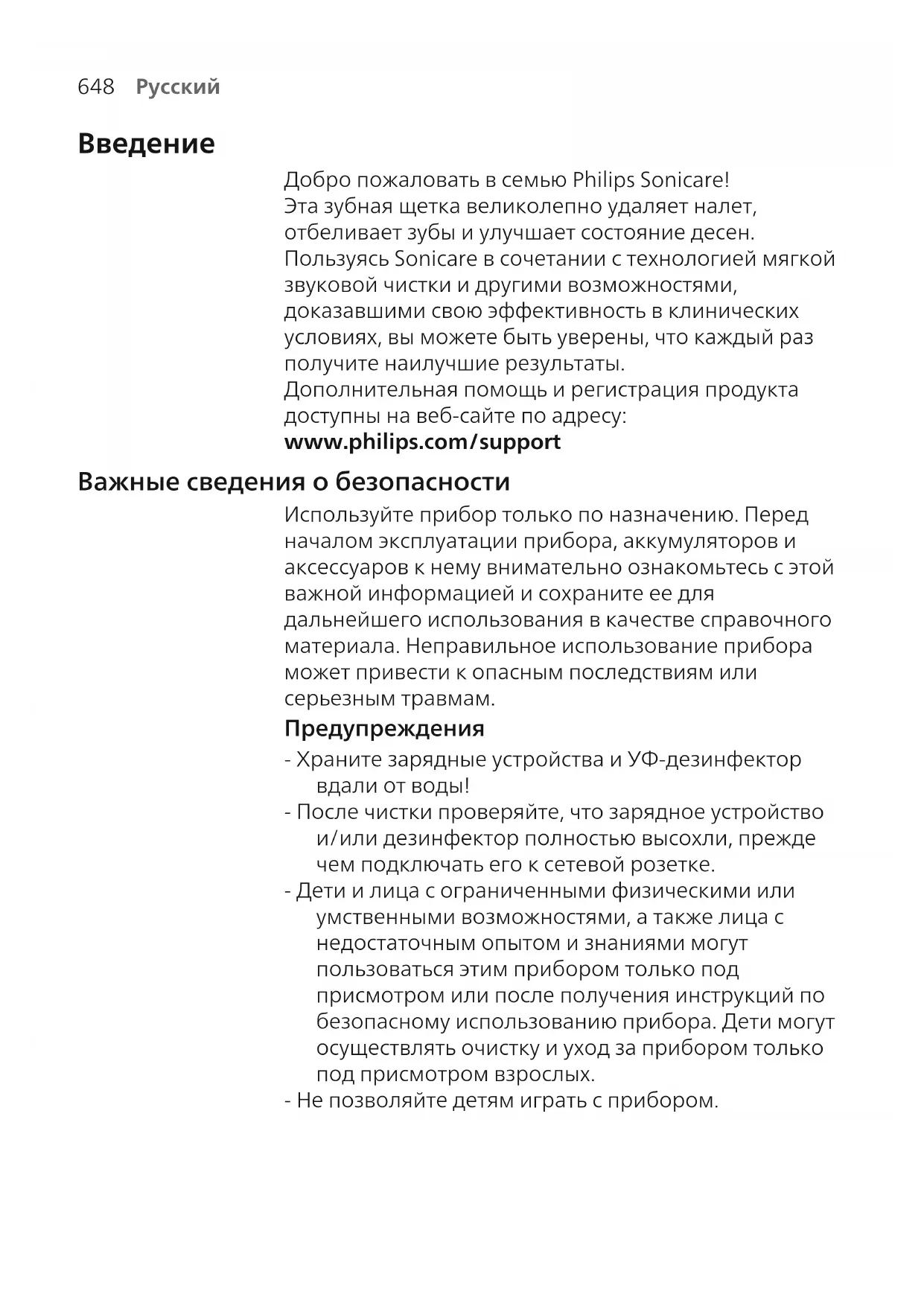 Добро пожаловать в семью Philips Sonicare! Эта зубная щетка великолепно удаляет налет, отбеливает зубы и улучшает состояние десен. Пользуясь Sonicare в сочетании с технологией мягкой звуковой чистки и другими возможностями, доказавшими свою эффективность в клинических условиях, вы можете быть уверены, что каждый раз получите наилучшие результаты. Дополнительная помощь и регистрация продукта доступны на веб-сайте по адресу: www.philips.com/support Важные сведения о безопасности Используйте прибор только по назначению. Перед началом эксплуатации прибора, аккумуляторов и аксессуаров к нему внимательно ознакомьтесь с этой важной информацией и сохраните ее для дальнейшего использования в качестве справочного материала. Неправильное использование прибора может привести к опасным последствиям или серьезным травмам. Предупреждения - Храните зарядные устройства и УФ-дезинфектор вдали от воды! - После чистки проверяйте, что зарядное устройство и/или дезинфектор полностью высохли, прежде чем подключать его к сетевой розетке. - Дети и лица с ограниченными физическими или умственными возможностями, а также лица с недостаточным опытом и знаниями могут пользоваться этим прибором только под присмотром или после получения инструкций по безопасному использованию прибора. Дети могут осуществлять очистку и уход за прибором только под присмотром взрослых. - Не позволяйте детям играть с прибором.649