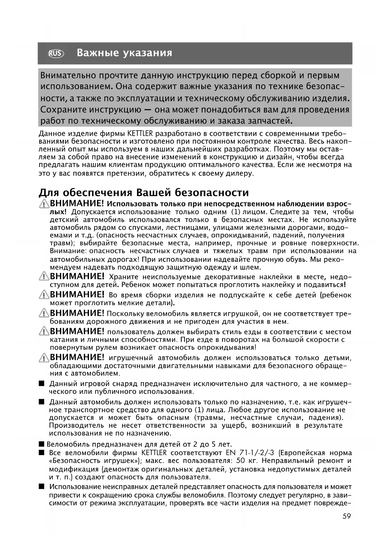 ROВажные указания Данное изделие фирмы KETTLER разработано в соответствии с современными требо- ваниями безопасности и изготовлено при постоянном контроле качества. Весь накоп- ленный опыт мы используем в наших дальнейших разработках. Поэтому мы остав- ляем за собой право на внесение изменений в конструкцию и дизайн, чтобы всегда предлагать нашим клиентам продукцию оптимального качества. Если же несмотря на это у вас появятся претензии, обратитесь к своему дилеру. Для обеспечения Вашей безопасности ВНИМАНИЕ! Использовать только при непосредственном наблюдении взрос- лых! Допускается использование только одним (1) лицом. Следите за тем, чтобы детский автомобиль использовался только в безопасных местах. Не используйте автомобиль рядом со спусками, лестницами, улицами железными дорогами, водо- емами и т.д. (опасность несчастных случаев, опрокидываний, падений, получения травм); выбирайте безопасные места, например, прочные и ровные поверхности. Внимание: опасность несчастных случаев и тяжелых травм при использовании на автомобильных дорогах! При использовании надевайте прочную обувь. Мы реко- мендуем надевать подходящую защитную одежду и шлем. ВНИМАНИЕ! Храните неиспользуемые декоративные наклейки в месте, недо- ступном для детей. Ребенок может попытаться проглотить наклейку и подавиться! ВНИМАНИЕ! Во время сборки изделия не подпускайте к себе детей (ребенок может проглотить мелкие детали). ВНИМАНИЕ! Поскольку веломобиль является игрушкой, он не соответствует тре- бованиям дорожного движения и не пригоден для участия в нем. ВНИМАНИЕ! пользователь должен выбирать стиль езды в соответствии с местом катания и личными способностями. При езде в поворотах на большой скорости с повернутым рулем возникает опасность опрокидывания! ВНИМАНИЕ! игрушечный автомобиль должен использоваться только детьми, обладающими достаточными двигательными навыками для безопасного обраще- ния с автомобилем. ■ Данный игровой снаряд предназначен исключительно для частного, а не коммер- ческого или публичного использования. ■ Данный автомобиль должен использовать только по назначению, т.е. как игрушеч- ное транспортное средство для одного (1) лица. Любое другое использование не допускается и может быть опасным (травмы, несчастные случаи, падения). Производитель не несет ответственности за ущерб, возникший в результате использования не по назначению. ■ Веломобиль предназначен для детей от 2 до 5 лет. ■ Все веломобили фирмы KETTLER соответствуют EN 71-1/-2/-3 (Европейская норма «Безопасность игрушек»); макс. вес пользователя: 50 кг. Неправильный ремонт и модификация (демонтаж оригинальных деталей, установка недопустимых деталей ит. п.) создают опасность для пользователя. ■ Использование неисправных деталей представляет опасность для пользователя и может привести к сокращению срока службы веломобиля. Поэтому следует регулярно, в зави- симости от режима эксплуатации, проверять все части изделия на предмет поврежде- Внимательно прочтите данную инструкцию перед сборкой и первым использованием. Она содержит важные указания по технике безопас- ности, а также по эксплуатации и техническому обслуживанию изделия. Сохраните инструкцию — она может понадобиться вам для проведения работ по техническому обслуживанию и заказа запчастей.