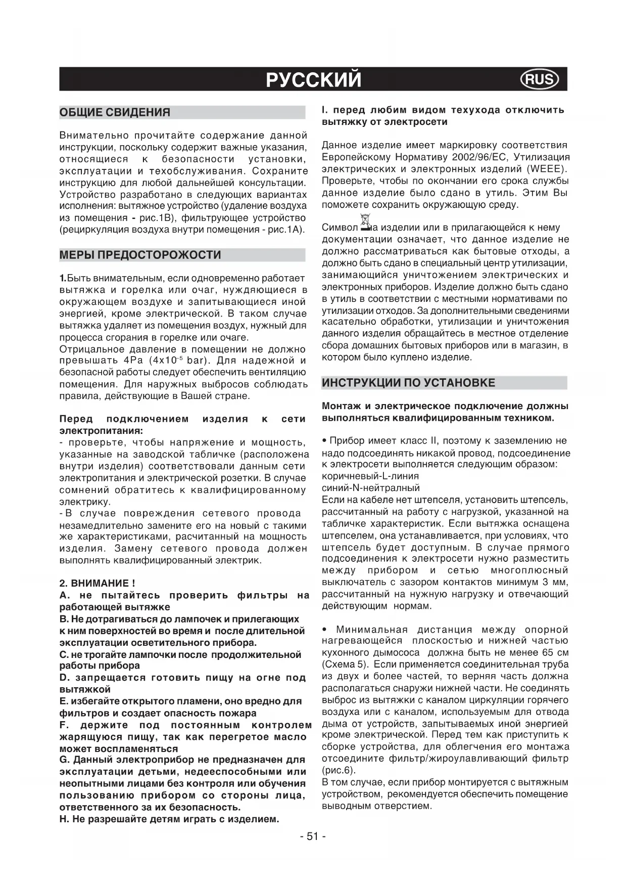 вытяжку от электросети Данное изделие имеет маркировку соответствия Европейскому Нормативу 2002/96/ЕС, Утилизация электрических и электронных изделий (WEEE). Проверьте, чтобы по окончании его срока службы данное изделие было сдано в утиль. Этим Вы поможете сохранить окружающую среду. Символ на изделии или в прилагающейся к нему документации означает, что данное изделие не должно рассматриваться как бытовые отходы, а должно быть сдано в специальный центр утилизации, занимающийся уничтожением электрических и электронных приборов. Изделие должно быть сдано в утиль в соответствии с местными нормативами по утилизации отходов. За дополнительными сведениями касательно обработки, утилизации и уничтожения данного изделия обращайтесь в местное отделение сбора домашних бытовых приборов или в магазин, в котором было куплено изделие. ИНСТРУКЦИИ ПО УСТАНОВКЕ Монтаж и электрическое подключение должны выполняться квалифицированным техником.