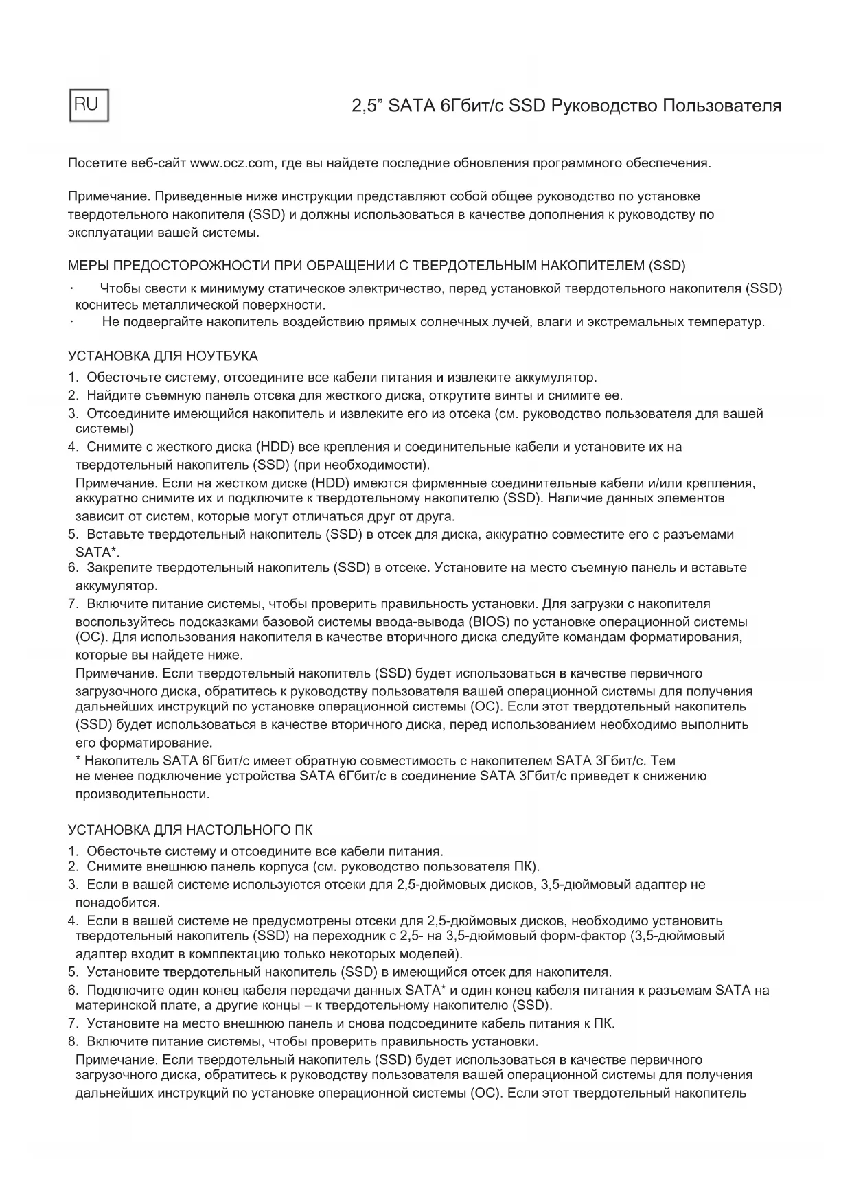 Примечание. Если твердотельный накопитель (SSD) будет использоваться в качестве первичного загрузочного диска, обратитесь к руководству пользователя вашей операционной системы для получения дальнейших инструкций по установке операционной системы (ОС). Если этот твердотельный накопитель 2,5” SATA 6Гбит/с SSD Руководство Пользователя RU(SSD) будет использоваться в качестве вторичного диска, перед использованием необходимо выполнить его форматирование.