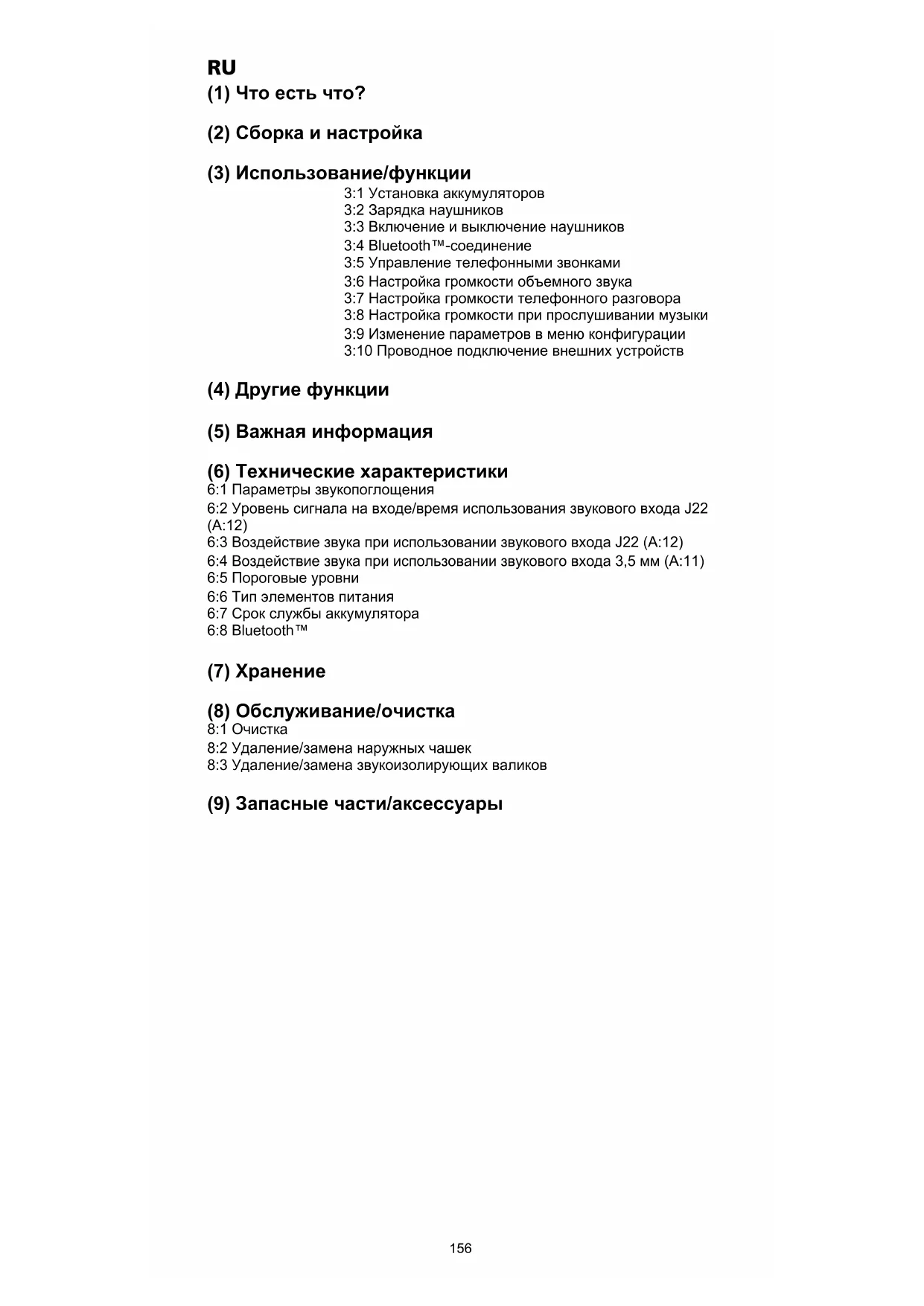 (1) Что есть что? (2) Сборка и настройка (3) Использование/функции 3:1 Установка аккумуляторов 3:2 Зарядка наушников 3:3 Включение и выключение наушников 3:4 Bluetooth™-соединение 3:5 Управление телефонными звонками 3:6 Настройка громкости объемного звука 3:7 Настройка громкости телефонного разговора 3:8 Настройка громкости при прослушивании музыки 3:9 Изменение параметров в меню конфигурации 3:10 Проводное подключение внешних устройств (4) Другие функции (5) Важная информация (6) Технические характеристики 6:1 Параметры звукопоглощения 6:2 Уровень сигнала на входе/время использования звукового входа J22 (A:12) 6:3 Воздействие звука при использовании звукового входа J22 (A:12) 6:4 Воздействие звука при использовании звукового входа 3,5 мм (A:11) 6:5 Пороговые уровни 6:6 Тип элементов питания 6:7 Срок службы аккумулятора 6:8 Bluetooth™ (7) Хранение (8) Обслуживание/очистка 8:1 Очистка 8:2 Удаление/замена наружных чашек 8:3 Удаление/замена звукоизолирующих валиков (9) Запасные части/аксессуары156