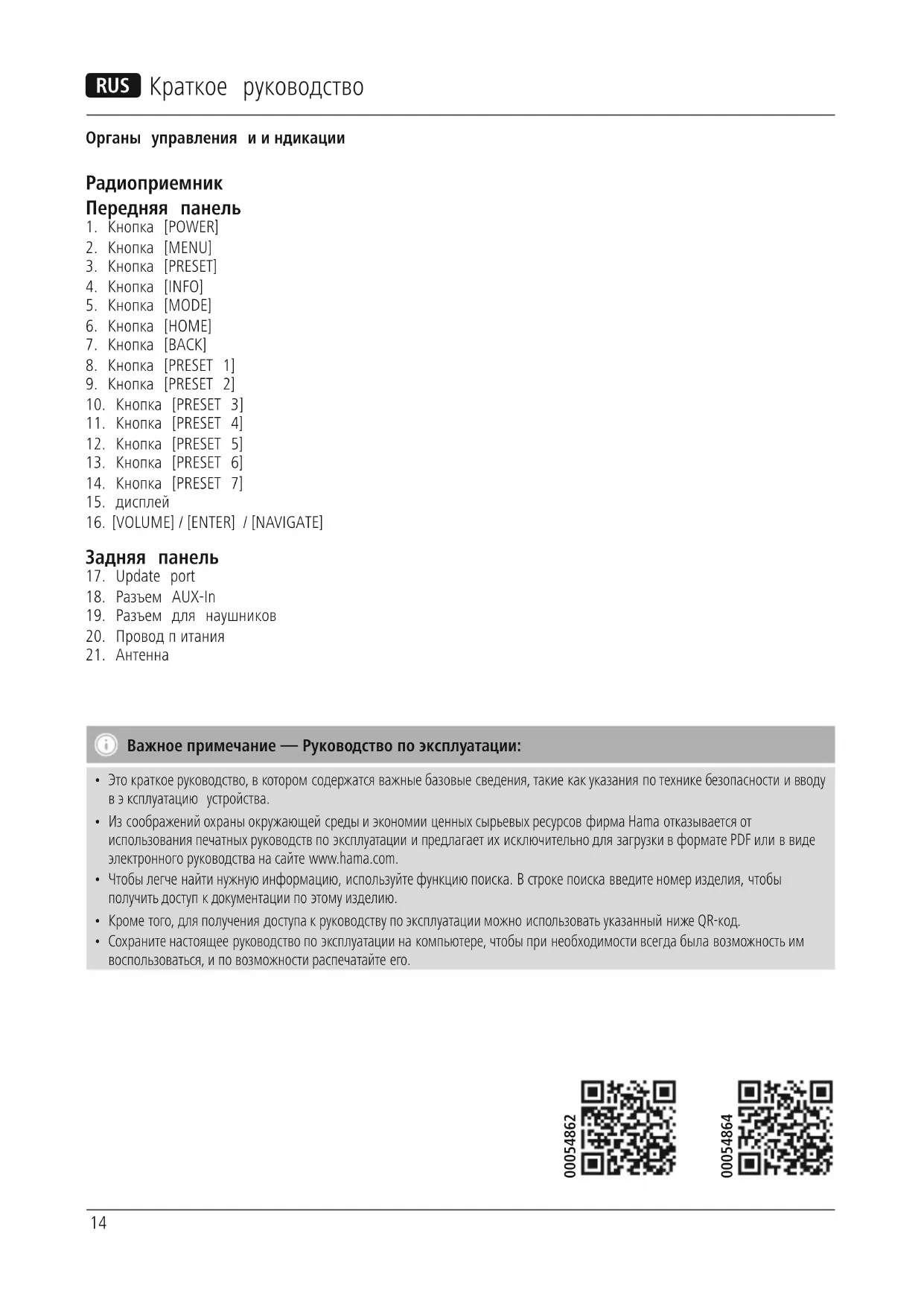 Downloads.14 R Краткое руководство Органы управления ииндикации Радиоприемник Передняя панель