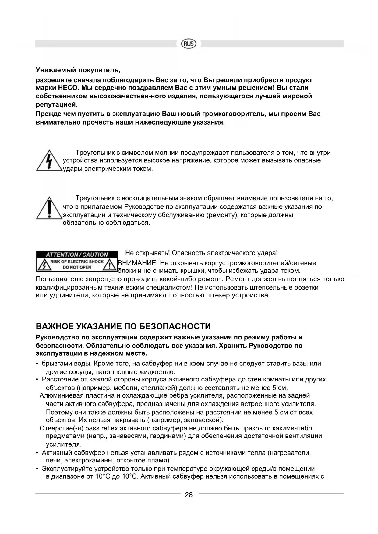 Треугольник с символом молнии предупреждает пользователя о том, что внутри устройства используется высокое напряжение, которое может вызывать опасные удары электрическим током. Треугольник с восклицательным знаком обращает внимание пользователя на то, что в прилагаемом Руководстве по эксплуатации содержатся важные указания по эксплуатации и техническому обслуживанию (ремонту), которые должны обязательно соблюдаться. Не открывать! Опасность электрического удара! ВНИМАНИЕ: Не открывать корпус громкоговорителей/сетевые блоки и не снимать крышки, чтобы избежать удара током. Пользователю запрещено проводить какой-либо ремонт. Ремонт должен выполняться только квалифицированным техническим специалистом! Не использовать штепсельные розетки или удлинители, которые не принимают полностью штекер устройства.