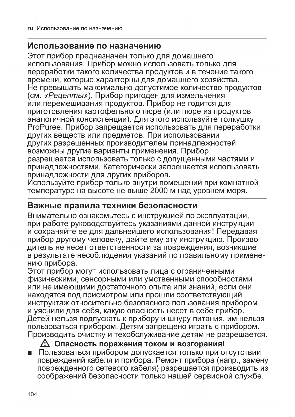 нашому представництві у Вас в країні. Умови гарантії для Німеччини та адреси Ви знайдете на останніх чотирьох сторінках цієї брошури. Крім того, умови гарантії розміщені також і в Інтернеті за зазначеною адресою. Для користування гарантійними послугами необхідно в будь-якому випадку показати квитанцію про оплату. Можливі зміни.104 ru Использование по назначению Использование по назначению Этот прибор предназначен только для домашнего использования. Прибор можно использовать только для переработки такого количества продуктов и в течение такого времени, которые характерны для домашнего хозяйства. Не превышать максимально допустимое количество продуктов (см. «Рецепты»). Прибор пригоден для измельчения или перемешивания продуктов. Прибор не годится для приготовления картофельного пюре (или пюре из продуктов аналогичной консистенции). Для этого используйте толкушку ProPuree. Прибор запрещается использовать для переработки других веществ или предметов. При использовании других разрешенных производителем принадлежностей возможны другие варианты применения. Прибор разрешается использовать только с допущенными частями и принадлежностями. Категорически запрещается использовать принадлежности для других приборов. Используйте прибор только внутри помещений при комнатной температуре на высоте не выше 2000 м над уровнем моря. Важные правила техники безопасности Внимательно ознакомьтесь с инструкцией по эксплуатации, при работе руководствуйтесь указаниями данной инструкции и сохраняйте ее для дальнейшего использования! Передавая прибор другому человеку, дайте ему эту инструкцию. Произво- дитель не несет ответственности за повреждения, возникшие в результате несоблюдения указаний по правильному примене- нию прибора. Этот прибор могут использовать лица с ограниченными физическими, сенсорными или умственными способностями или не имеющими достаточного опыта или знаний, если они находятся под присмотром или прошли соответствующий инструктаж относительно безопасного пользования прибором и уяснили для себя, какую опасность несет в себе прибор. Детей нельзя подпускать к прибору и шнуру питания, им нельзя пользоваться прибором. Детям запрещено играть с прибором. Производить очистку и техобслуживание детям не разрешается. W Опасность поражения током и возгорания! ■ Пользоваться прибором допускается только при отсутствии повреждений кабеля и прибора. Ремонт прибора (напр., замену поврежденного сетевого кабеля) разрешается производить из соображений безопасности только нашей сервисной службе.105 ru Важные правила техники безопасности ■ Категорически запрещается подключать прибор к таймерам или розеткам с дистанционным управлением. Всегда следите за прибором во время эксплуатации! ■ Ни в коем случае не ставьте прибор на горячие поверхности, например, на электроплиту, или вблизи них. ■ Ни в коем случае не погружайте основной блок в жидкости, не мойте его под проточной водой и в посудомоечной машине. Не используйте паровые очистители. Не используйте прибор влажными руками. ■ В случае падения прибора в воду или другую жидкость дальнейшее применение прибора запрещено. ■ Погружать ножку блендера в смешиваемый продукт не глубже, чем до отметки Í, так как иначе возникает опасность поражения током! ■ После каждого применени