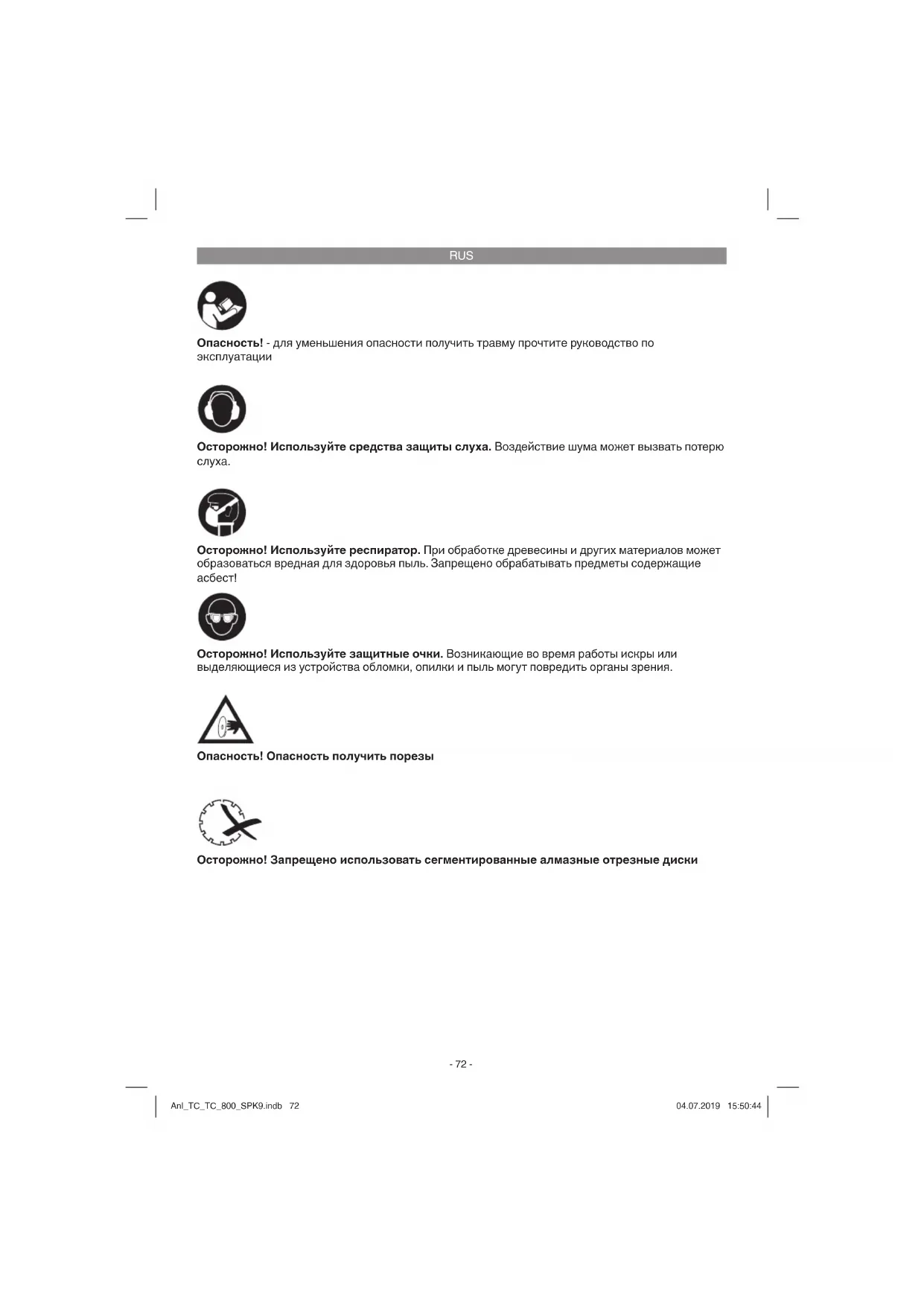 Опасность! Опасность получить порезы Осторожно! Запрещено использовать сегментированные алмазные отрезные диски Anl_TC_TC_800_SPK9.indb 72Anl_TC_TC_800_SPK9.indb 72 04.07.2019 15:50:4404.07.2019 15:50:44RUS