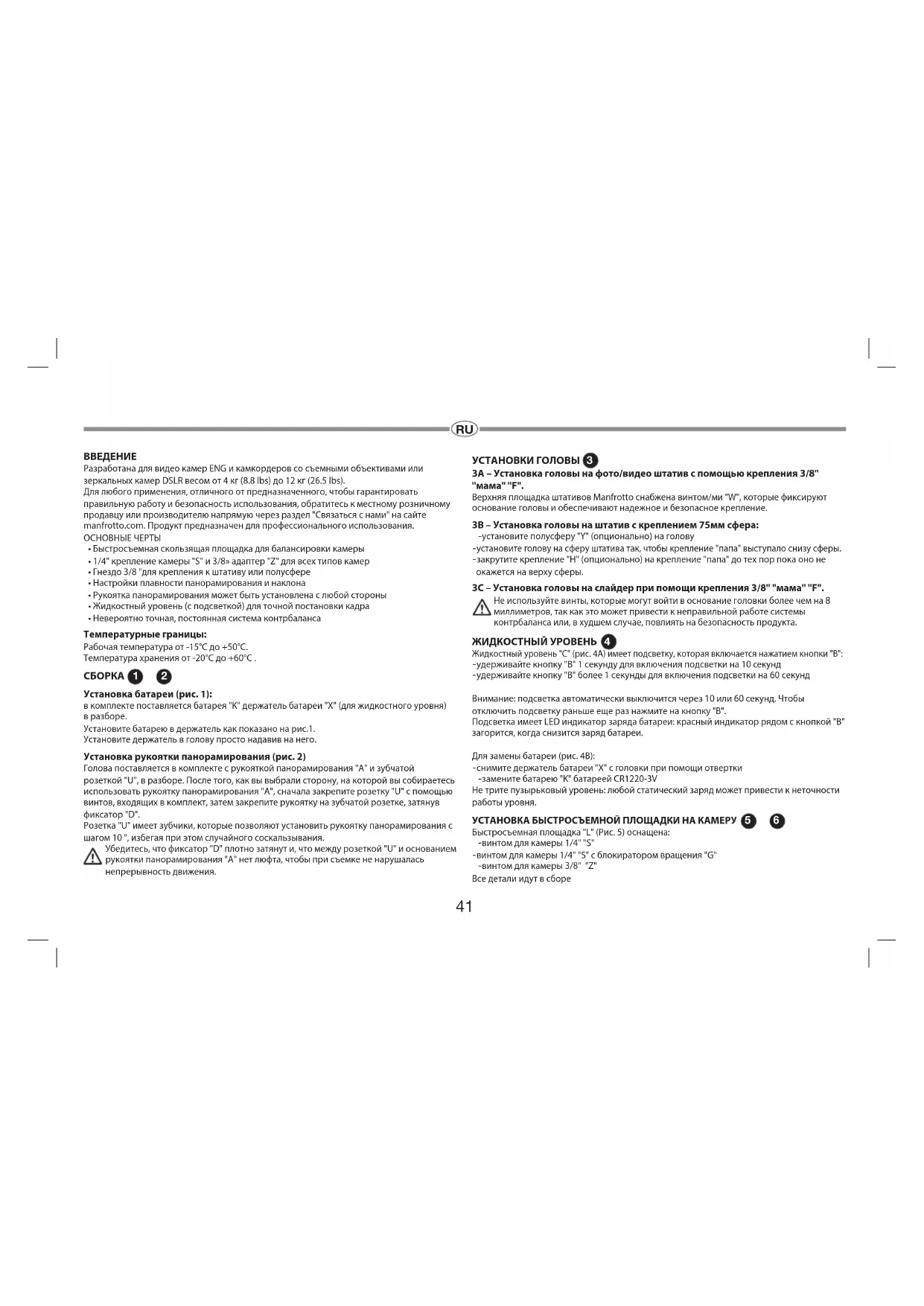 УСТАНОВКИ ГОЛОВЫ 3A – Установка головы на фото/видео штатив с помощью крепления 3/8" "мама" "F". Верхняя площадка штативов Manfrotto снабжена винтом/ми "W", которые фиксируют основание головы и обеспечивают надежное и безопасное крепление. 3B – Установка головы на штатив с креплением 75мм сфера: -установите полусферу "Y" (опционально) на голову -установите голову на сферу штатива так, чтобы крепление "папа" выступало снизу сферы. -закрутите крепление "H" (опционально) на крепление "папа" до тех пор пока оно не окажется на верху сферы. 3C – Установка головы на слайдер при помощи крепления 3/8" "мама" "F". Не используйте винты, которые могут войти в основание головки более чем на 8 миллиметров, так как это может привести к неправильной работе системы контрбаланса или, в худшем случае, повлиять на безопасность продукта. ЖИДКОСТНЫЙ УРОВЕНЬ Жидкостный уровень "C" (рис. 4A) имеет подсветку, которая включается нажатием кнопки "B": -удерживайте кнопку "B" 1 секунду для включения подсветки на 10 секунд -удерживайте кнопку "B" более 1 секунды для включения подсветки на 60 секунд Внимание: подсветка автоматически выключится через 10 или 60 секунд. Чтобы отключить подсветку раньше еще раз нажмите на кнопку "B". Подсветка имеет LED индикатор заряда батареи: красный индикатор рядом с кнопкой "B" загорится, когда снизится заряд батареи. Для замены батареи (рис. 4B): -снимите держатель батареи "X" с головки при помощи отвертки -замените батарею "K" батареей CR1220-3V Не трите пузырьковый уровень: любой статический заряд может привести к неточности работы уровня. УСТАНОВКА БЫСТРОСЪЕМНОЙ ПЛОЩАДКИ НА КАМЕРУ И Быстросъемная площадка "L" (Рис. 5) оснащена: -винтом для камеры 1/4" "S" -винтом для камеры 1/4" "S" с блокиратором вращения "G" -винтом для камеры 3/8" "Z" Все детали идут в сборе
