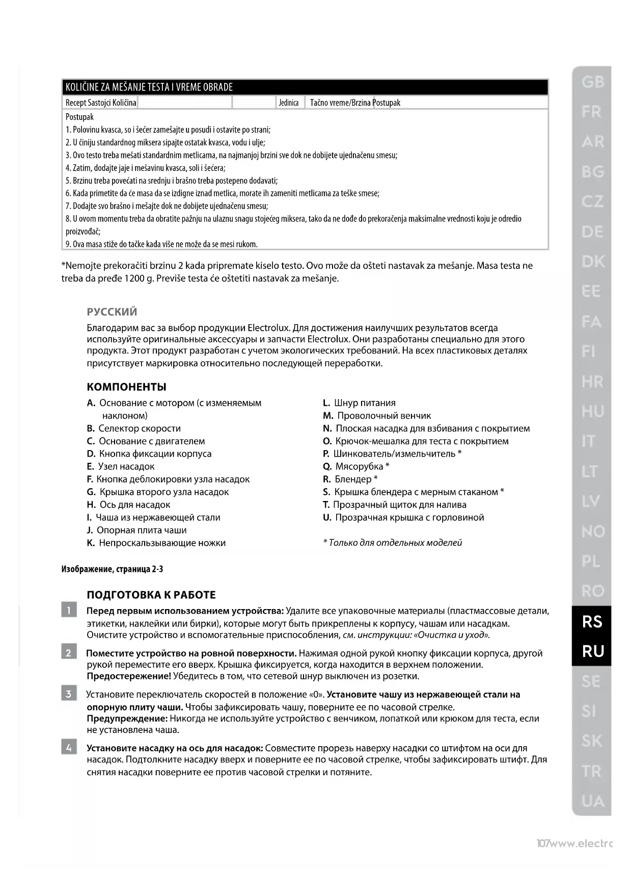 - Только для отдельных моделей Изображение, страница 2-3 ПОДГОТОВКА К РАБОТЕ 1 Перед первым использованием устройства: Удалите все упаковочные материалы (пластмассовые детали, этикетки, наклейки или бирки), которые могут быть прикреплены к корпусу, чашам или насадкам. Очистите устройство и вспомогательные приспособления, см. инструкции: «Очистка и уход». 2 Поместите устройство на ровной поверхности. Нажимая одной рукой кнопку фиксации корпуса, другой рукой переместитеего вверх. Крышка фиксируется, когда находится в верхнем положении. Предостережение! Убедитесь в том, что сетевой шнур выключен из розетки. 3 Установите переключатель скоростей в положение «0». Установите чашу из нержавеющей стали на опорную плиту чаши. Чтобы зафиксировать чашу, поверните ее по часовой стрелке. Предупреждение: Никогда не используйте устройство с венчиком,лопаткой или крюком для теста, если не установлена чаша. 4 Установите насадку на ось для насадок: Совместите прорезь наверху насадки со штифтом на оси для насадок. Подтолкните насадку вверх и поверните ее по часовой стрелке, чтобы зафиксировать штифт. Для снятия насадки поверните ее против часовой стрелки и потяните.108 www.electrolux.com 5 Наклоните головку с насадкой до фиксации: одной рукой нажмите кнопку фиксации наклона головки, а другой рукой опустите головку двигателя. Вставьте вилку шнура питания в розетку. Поместите щиток для налива вверху чаши таким образом, чтобы инструмент проходил через отверстие в щитке для налива. Поверните щиток для налива в желаемое положение. Используйте желобок, чтобы избежать разлива ингредиентов. Подсоедините желобок к щитку для налива с помощью крючков на желобке. Внимание! Держите руки и пальцы вдалеке от движущихся частей. 6 Переместите селектор скорости с положения «0» на отметку требуемой скорости (1–6). По окончании смешивания переведите селектор скорости в положение «0» и извлеките вилку прибора из розетки. 7 Если устройство отключено от сети, а переключатель скоростей остается в режиме скорости от 1 до 6: Устройство не запустится автоматически. Установите переключатель скоростей на «0», а затем выберите нужную скорость. ДРУГИЕ ФУНКЦИИ 8 Узел насадок: Устройство оснащено двумя встроенными многоцелевыми узлами насадок, один из которых находится спереди (A) и один сзади (B). Прочтите инструкции, которые прилагаются к каждой насадке, и строго следуйте им для правильного и безопасного использования. ИСПОЛЬЗОВАНИЕ МЯСОРУБКИ* 9 Вставьте шнек мясорубки (B) в корпус мясорубки (A). Наденьте нож (С) на квадратный вал на конце шнека мясорубки. Поставьте поверх ножа (D) крупную или среднюю нож-сетку. Затяните рукой кольцо (Е) до надежной фиксации мясорубки. Примечание. Не перетягивайте кольцо. 10 Нажмите кнопку деблокировки переднего узла насадоквправо иснимите крышку узла насадок. Вставьте вал привода насадки в узел для насадок прибора. Когда мясорубка надежно закреплена, кнопка деблокировки насадки зафиксируется со щелчком. Установите контейнер под насадкой. Внимание! Перед установкой принадлежностей выключите прибор и выньте его вилку из розетки. 11 Нарежьте сырое мясо небольшими кусочками и положите его в поддон для продуктов. Включите прибор и установите селектор скорости на 3-4. Подавайте мясо в загрузочный желоб с помощью толкателя. Внимание! Не вставляйте пальцы или ин