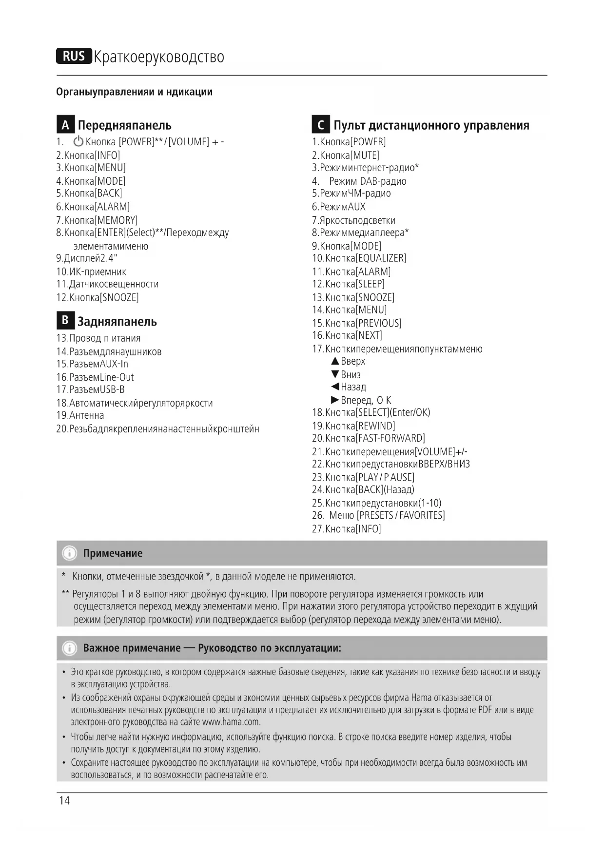 - Кнопки, отмеченныезвездочкой *, вданной моделенеприменяются. ** Регуляторы 1 и 8 выполняют двойную функцию. Приповороте регулятораизменяется громкость или осуществляется переход между элементамименю. Принажатииэтого регулятораустройствопереходит вждущий режим (регулятор громкости) илиподтверждается выбор (регуляторпереходамеждуэлементами меню). Важное примечание — Руководство по эксплуатации: