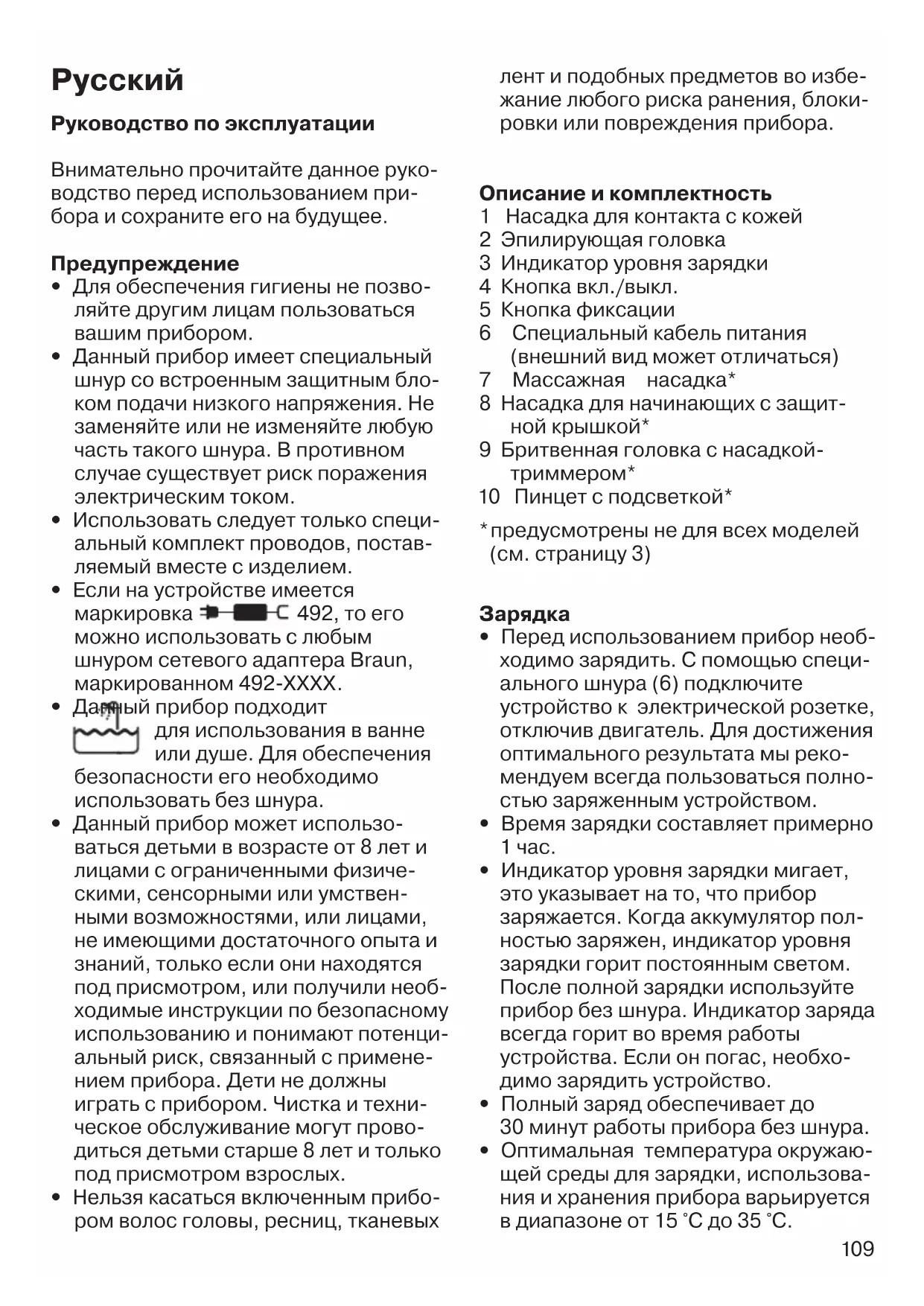 Содержит аккумуляторы и/или подлежащие переработке электронные отходы. Использо- ванное устройство не должно выбрасываться с общими отходами или мусором. Пожалуйста, утилизи- руйте их через центр обслуживания Braun или через соответствующий специализированный пункт сбора (при наличии в вашем регионе). По вопросам выполнения гарантийного или послегарантийного обслуживания, а также в случае возникновения про- блем при использовании продукции, просьба связываться с Информацион- ной Службой Сервиса BRAUN по теле- фону 8 800 200 2020. В изделие могут быть внесены измене- ния без предварительного уведомления. Электрический эпилятор Braun тип 5390 с сетевым блоком питания тип 492-XXXX. Если изделие (на корпусе) промарки- ровано цифрами 492, то вы можете использовать его только с источником питания маркированным кодом 492-