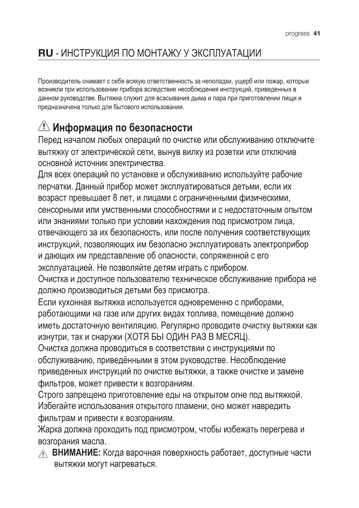 Αφαιρέστε τον κατεστραμμένο λαμπτήρα κι εν συνεχεία αντικαταστήστε τον (συμβουλευτείτε τον πίνακα που ακολουθεί): Λαμπτήρας Ισχύς (W) Βύσμα 3 E14 Τάση (V) Διαστάσεις (mm) 220-240 35x102 (διάμετρος x Μήκος) Κωδικός ILCOS D (σύμφωνα με τον IEC 61231) DRBB/C-3-220-240-E14-35/10240 progressprogress 41 RU - ИНСТРУКЦИЯ ПО МОНТАЖУ У ЭКСПЛУАТАЦИИ Производитель снимает с себя всякую ответственность за неполадки, ущерб или пожар, которые возникли при использовании прибора вследствие несоблюдения инструкций, приведенных в данном руководстве. Вытяжка служит для всасывания дыма и пара при приготовлении пищи и предназначена только для бытового использования. Информация по безопасности Перед началом любых операций по очистке или обслуживанию отключите вытяжку от электрической сети, вынув вилку из розетки или отключив основной источник электричества. Для всех операций по установке и обслуживанию используйте рабочие перчатки. Данный прибор может эксплуатироваться детьми, если их возраст превышает 8 лет, и лицами с ограниченными физическими, сенсорными или умственными способностями и с недостаточным опытом или знаниями только при условии нахождения под присмотром лица, отвечающего за их безопасность, или после получения соответствующих инструкций, позволяющих им безопасно эксплуатировать электроприбор и дающих им представление об опасности, сопряженной с его эксплуатацией. Не позволяйте детям играть с прибором. Очистка и доступное пользователю техническое обслуживание прибора не должно производиться детьми без присмотра. Если кухонная вытяжка используется одновременно с приборами, работающими на газе или других видах топлива, помещение должно иметь достаточную вентиляцию. Регулярно проводите очистку вытяжки как изнутри, так и снаружи (ХОТЯ БЫ ОДИН РАЗ В МЕСЯЦ). Очистка должна проводиться в соответствии с инструкциями по обслуживанию, приведёнными в этом руководстве. Несоблюдение приведенных инструкций по очистке вытяжки, а также очистке и замене фильтров, может привести к возгораниям. Строго запрещено приготовление еды на открытом огне под вытяжкой. Избегайте использования открытого пламени, оно может навредить фильтрам и привести к возгораниям. Жарка должна проходить под присмотром, чтобы избежать перегрева и возгорания масла. ВНИМАНИЕ: Когда варочная поверхность работает, доступные части вытяжки могут нагреваться.42 progress Правила по техники безопасности Для замены лампочки освещения использовать только тип лампочки указанный в разделе обслуживания/замены лампочки этого руководства. Внимание! Не подключать прибор к электрической сети до тех пор, пока установка полностью не закончена. Что касается технических мер и условий по технике безопасности при отводе дымов, то необходимо строго следовать законам, установленным местными властями. Всасываемый воздух не должен выпускаться в трубу, используемую для выбросов дымов приборами, работающими на газу или других видах топлива. Не используйте и не оставляйте