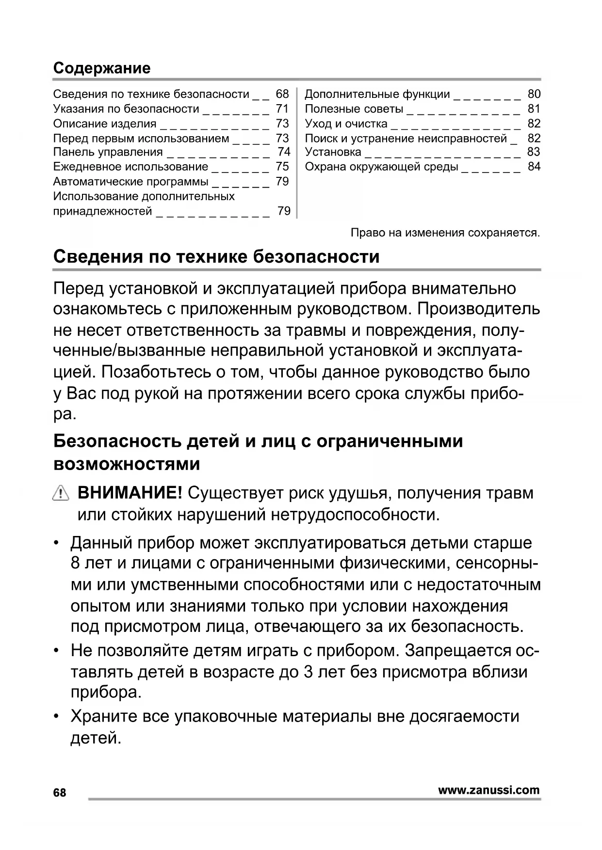www.zanussi.comСодержание Сведения по технике безопасности _ _ 68 Указания по безопасности _ _ _ _ _ _ _ 71 Описание изделия _ _ _ _ _ _ _ _ _ _ _ 73 Перед первым использованием _ _ _ _ 73 Панель управления _ _ _ _ _ _ _ _ _ _ 74 Ежедневное использование _ _ _ _ _ _ 75 Автоматические программы _ _ _ _ _ _ 79 Использование дополнительных принадлежностей _ _ _ _ _ _ _ _ _ _ _ 79 Дополнительные функции _ _ _ _ _ _ _ 80 Полезные советы _ _ _ _ _ _ _ _ _ _ _ 81 Уход и очистка _ _ _ _ _ _ _ _ _ _ _ _ _ 82 Поиск и устранение неисправностей _ 82 Установка _ _ _ _ _ _ _ _ _ _ _ _ _ _ _ _ 83 Охрана окружающей среды _ _ _ _ _ _ 84 Право на изменения сохраняется. Сведения по технике безопасности Перед установкой и эксплуатацией прибора внимательно ознакомьтесь с приложенным руководством. Производитель не несет ответственность за травмы и повреждения, полу- ченные/вызванные неправильной установкой и эксплуата- цией. Позаботьтесь о том, чтобы данное руководство было у Вас под рукой на протяжении всего срока службы прибо-