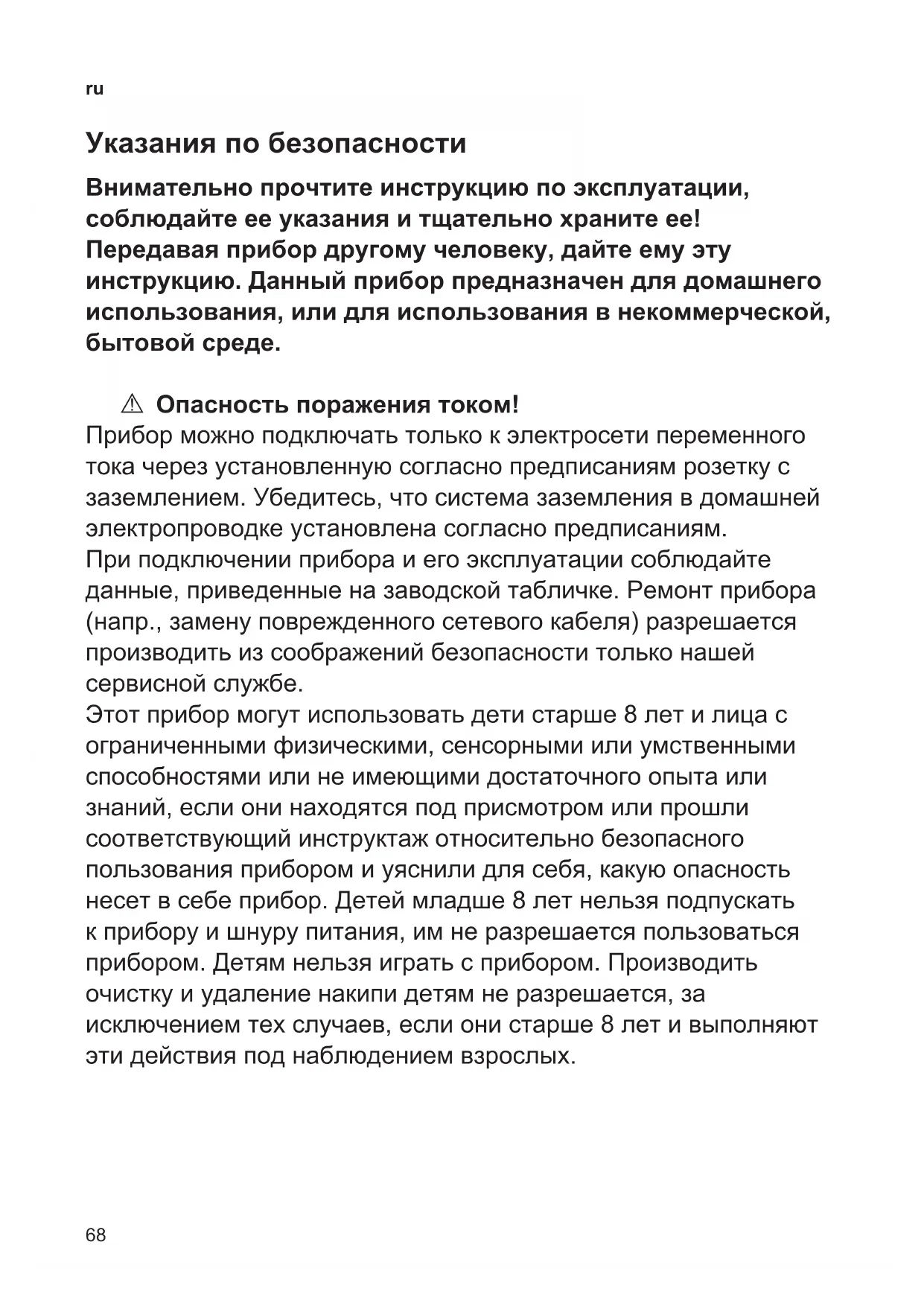 Указания по безопасности Внимательно прочтите инструкцию по эксплуатации, соблюдайте ее указания и тщательно храните ее! Передавая прибор другому человеку, дайте ему эту инструкцию. Данный прибор предназначен для домашнего использования, или для использования в некоммерческой, бытовой среде. A Опасность поражения током! Прибор можно подключать только к электросети переменного тока через установленную согласно предписаниям розетку с заземлением. Убедитесь, что система заземления в домашней электропроводке установлена согласно предписаниям. При подключении прибора и его эксплуатации соблюдайте данные, приведенные на заводской табличке. Ремонт прибора (напр., замену поврежденного сетевого кабеля) разрешается производить из соображений безопасности только нашей сервисной службе. Этот прибор могут использовать дети старше 8 лет и лица с ограниченными физическими, сенсорными или умственными способностями или не имеющими достаточного опыта или знаний, если они находятся под присмотром или прошли соответствующий инструктаж относительно безопасного пользования прибором и уяснили для себя, какую опасность несет в себе прибор. Детей младше 8 лет нельзя подпускать к прибору и шнуру питания, им не разрешается пользоваться прибором. Детям нельзя играть с прибором. Производить очистку и удаление накипи детям не разрешается, за исключением тех случаев, если они старше 8 лет и выполняют эти действия под наблюдением взрослых.69