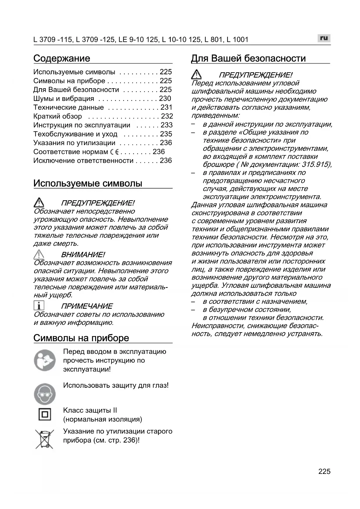 Обозначает советы по использованию и важную информацию. Символы на приборе Перед вводом в эксплуатацию прочесть инструкцию по эксплуатации! Использовать защиту для глаз! Kласс защиты II (нормальная изоляция) Указание по утилизации старого прибора (см. стр. 236)! Для Вашей безопасности ПРЕДУПРЕЖДЕHИЕ! Перед использованием угловой шлифовальной машины необходимо прочесть перечисленную документацию и действовать согласно указаниям, приведенным: