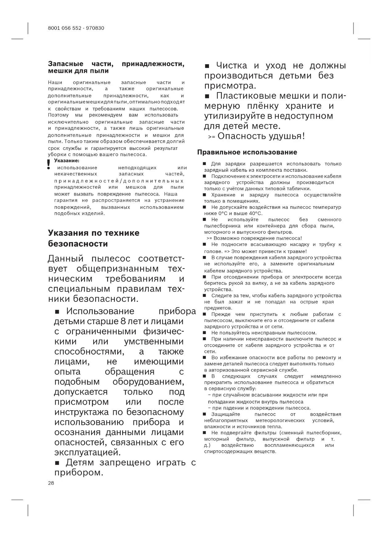 Сохраните инструкцию по эксплуатации. При передаче пылесоса новому владельцу не забудьте передать также инструкцию по эксплуатации. Указания по использованию Этот прибор предназначен только для домашнего использования и в бытовых условиях. Данный прибор предназначен для использования на высоте не более 2000 м над уровнем моря. Во избежание травм и повреждений пылесос нельзя использовать для: чистки людей и животных; всасывания: − вредных для здоровья веществ, острых, горячих или раскалённых предметов; − мокрых предметов и жидкостей; − легковоспламеняющихся или взрывчатых веществ и газов; − пепла, сажи из кафельных печей и систем центрального отопления; − тонера из принтеров или копировальных аппаратов.28 8001 056 552 - 970830 Запасные части, принадлежности, мешки для пыли Наши оригинальные запасные части и принадлежности, а также оригинальные дополнительные принадлежности, как и оригинальные мешки для пыли, оптимально подход ят к свойствам и требованиям наших пылесосов. Поэтому мы рекомендуем вам использовать исключительно оригинальные запасные части и принадлежности, а также лишь оригинальные дополнительные принадлежности и мешки для пыли. Только таким образом обеспечивается долгий срок службы и гарантируется высокий результат уборки с помощью вашего пылесоса. Указание: использование неподходящих или некачественных запасных частей, принадлежностей/дополнительных принадлежностей или мешков для пыли может вызвать повреждение пылесоса. Наша гарантия не распространяется на устранение повреждений, вызванных использованием подобных изделий. Указания по технике безопасности Данный пылесос соответст- вует общепризнанным тех- ническим требованиям и специальным правилам тех- ники безопасности. Использование прибора детьми старше 8 лет и лицами с ограниченными физичес- кими или умственными способностями, а также лицами, не имеющими опыта обращения с подобным оборудованием, допускается только под присмотром или после инструктажа по безопасному использованию прибора и осознания данными лицами опасностей, связанных с его эксплуатацией. Детям запрещено играть с