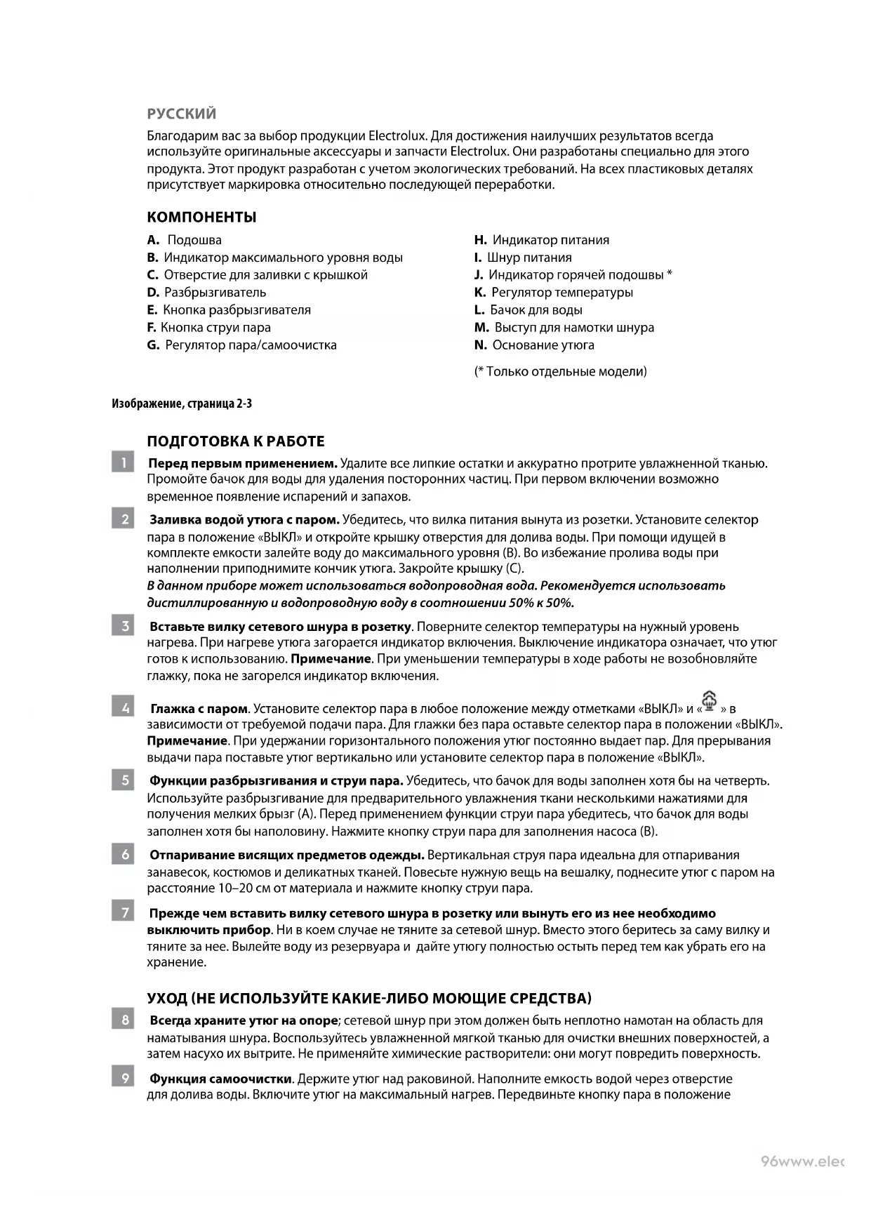 J. Индикатор горячей подошвы * K. Регулятор температуры L. Бачок для воды M. Выступ для намотки шнура N. Основаниеутюга (* Tолько отдельные модели) Изображение, страница 2-3 ПОДГОТОВКА К РАБОТЕ 1 Перед первым применением. Удалите все липкие остатки и аккуратно протрите увлажненной тканью. Промойте бачок для воды для удаления посторонних частиц. При первом включении возможно временное появление испарений и запахов. 2 Заливка водой утюга с паром. Убедитесь, что вилка питания вынута из розетки. Установите селектор пара в положение «ВЫКЛ» и откройте крышку отверстия для долива воды. При помощи идущей в комплекте емкости залейте воду до максимального уровня (В). Во избежание пролива воды при наполнении приподнимите кончик утюга. Закройте крышку (C). В данном приборе может использоваться водопроводная вода. Рекомендуется использовать дистиллированную и водопроводную воду в соотношении 50% к 50%. 3 Вставьте вилку сетевого шнура в розетку. Поверните селектор температуры на нужный уровень нагрева. При нагреве утюга загорается индикатор включения. Выключение индикатора означает, что утюг готов к использованию. Примечание. При уменьшении температуры в ходе работы не возобновляйте глажку, пока не загорелся индикатор включения. 4 Глажка с паром. Установите селектор пара в любое положение между отметками «ВЫКЛ» и «