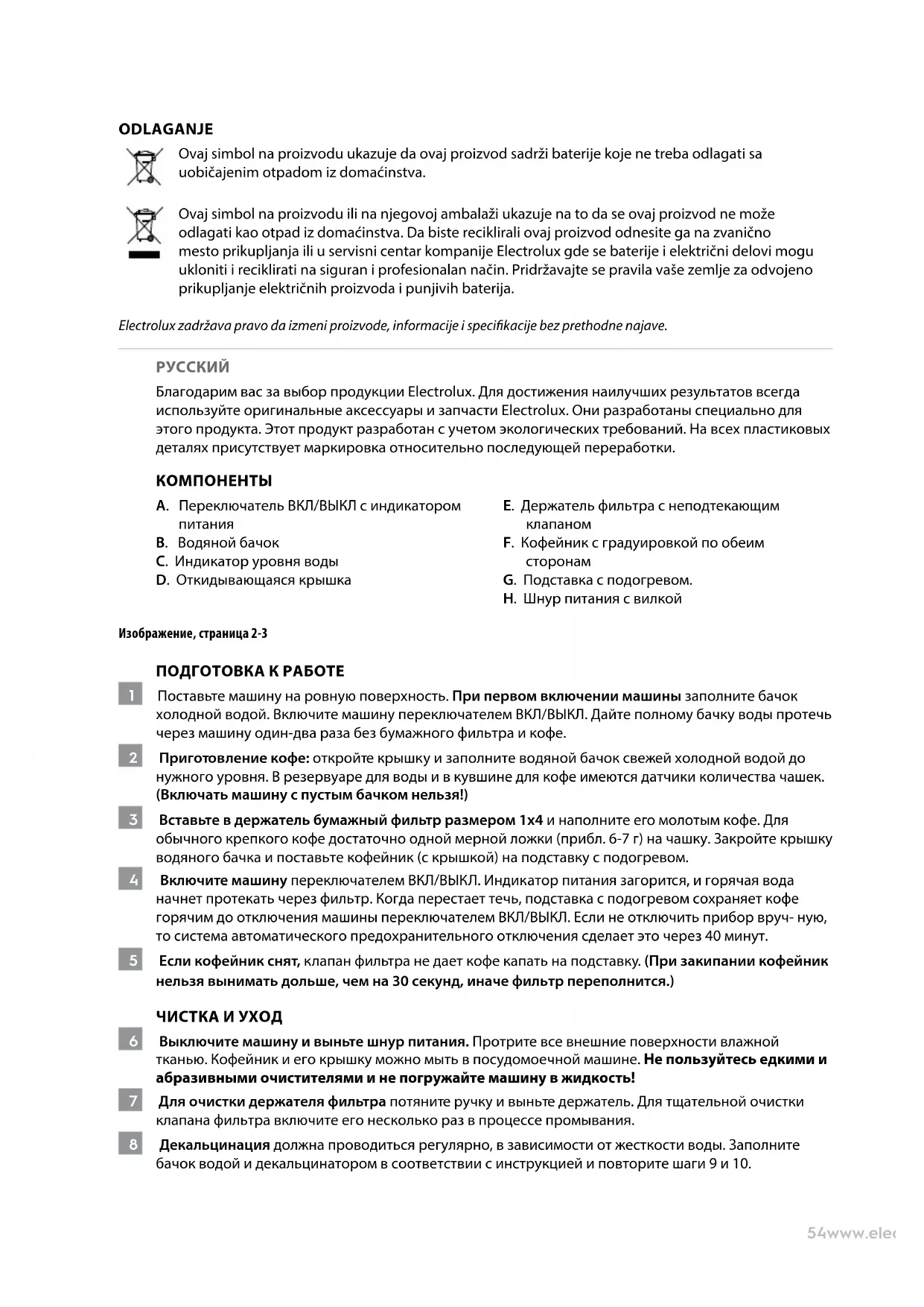 G. Подставка с подогревом. H. Шнур питания с вилкой Изображение, страница 2-3 ПОДГОТОВКА К РАБОТЕ 1 Поставьте машину на ровную поверхность. При первом включении машины заполните бачок холодной водой. Включите машину переключателем ВКЛ/ВЫКЛ. Дайте полному бачку воды протечь через машину один-два раза без бумажного фильтра и кофе. 2 Приготовление кофе: откройте крышку и заполните водяной бачок свежей холодной водой до нужного уровня. В резервуаре для воды и в кувшине для кофе имеются датчики количества чашек. (Включать машину с пустым бачком нельзя!) 3 Вставьте в держатель бумажный фильтр размером 1x4 и наполните его молотым кофе. Для обычного крепкого кофе достаточно одной мерной ложки (прибл. 6-7 г) на чашку. Закройте крышку водяного бачка и поставьте кофейник (с крышкой) на подставку с подогревом. 4 Включите машину переключателем ВКЛ/ВЫКЛ. Индикатор питания загорится, и горячая вода начнет протекать через фильтр. Когда перестает течь, подставка с подогревом сохраняет кофе горячим до отключения машины переключателем ВКЛ/ВЫКЛ. Если не отключить прибор вруч- ную, то система автоматического предохранительного отключения сделает это через 40 минут. 5 Если кофейник снят, клапан фильтра не дает кофе капать на подставку. (При закипании кофейник нельзя вынимать дольше, чем на 30 секунд, иначе фильтр переполнится.) ЧИСТКА И УХОД 6 Выключите машину и выньте шнур питания. Протрите все внешние поверхности влажной тканью. Кофейник и его крышку можно мыть в посудомоечной машине. Не пользуйтесь едкими и абразивными очистителями и не погружайте машину в жидкость! 7 Для очистки держателя фильтра потяните ручку и выньте держатель. Для тщательной очистки клапана фильтра включите его несколько раз в процессе промывания. 8 Декальцинация должна проводиться регулярно, в зависимости от жесткости воды. Заполните бачок водой и декальцинатором в соответствии с инструкцией и повторите шаги 9 и 10.55www.electrolux.com