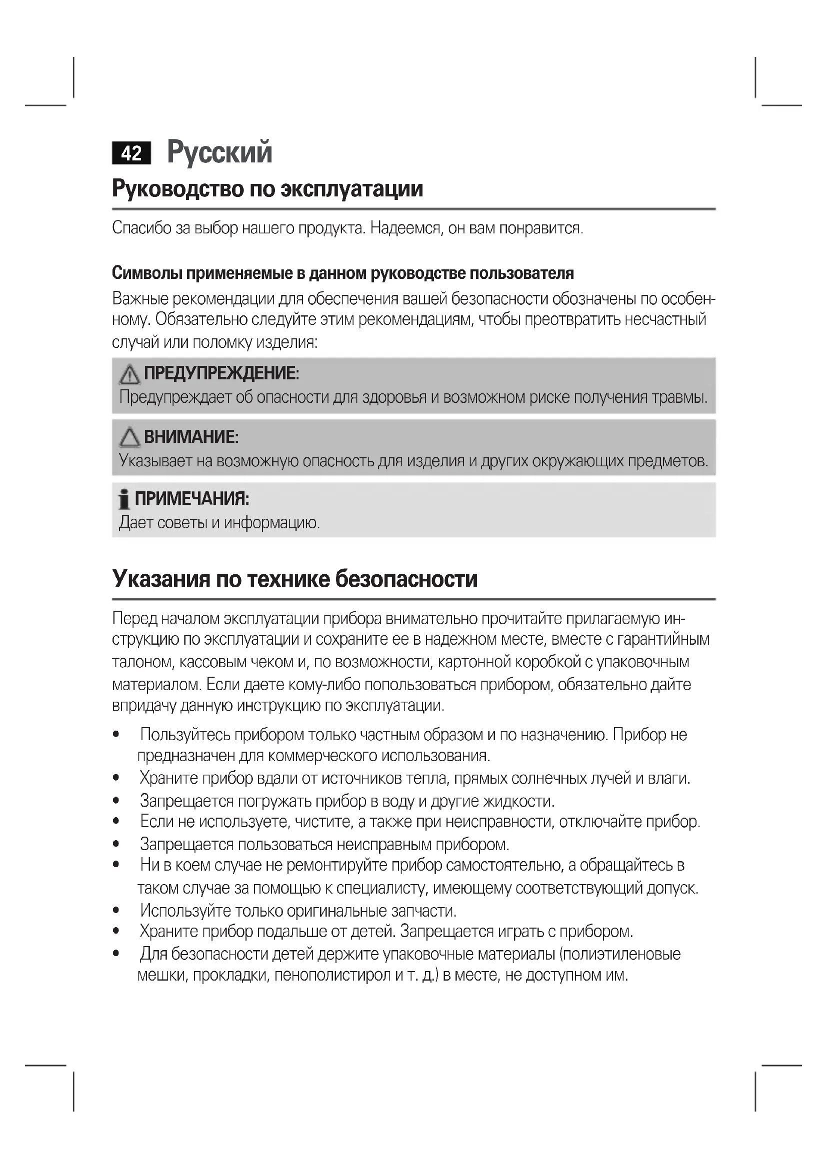 Указывает на возможную опасность для изделия и других окружающих предметов. ПРИМЕЧАНИЯ: Дает советы и информацию. Указания по технике безопасности Перед началом эксплуатации прибора внимательно прочитайте прилагаемую ин- струкцию по эксплуатации и сохраните ее в надежном месте, вместе с гарантийным талоном, кассовым чеком и, по возможности, картонной коробкой с упаковочным материалом. Если даете кому-либо попользоваться прибором, обязательно дайте впридачу данную инструкцию по эксплуатации.