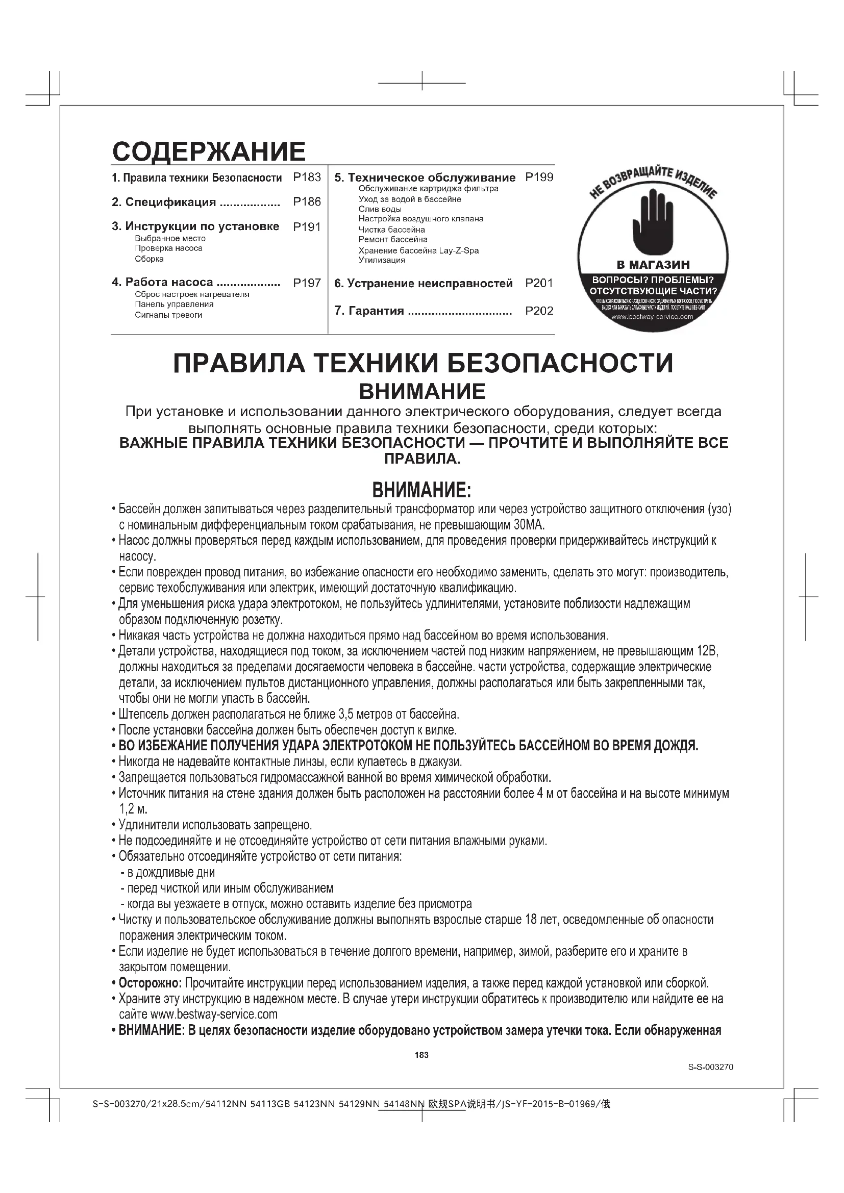 ВАЖНО: БУДЕТ ВЫПОЛНЕНА ЗАМЕНА ТОЛЬКО ПОВРЕЖДЕННОГО КОМПОНЕНТА, А НЕ ВСЕГО КОМПЛЕКТА. Компания Bestway оставляет за собой право запросить фотографические свидетельства дефектных компонентов либо потребовать выслать компонент для дополнительного тестирования. В целях оказания вам максимальной помощи просим предоставлять полную информацию.S-S-003270/21x28.5cm/54112NN 54113GB 54123NN 54129NN 54148NN 欧规SPA说明书/JS-YF-2015-B-01969/波