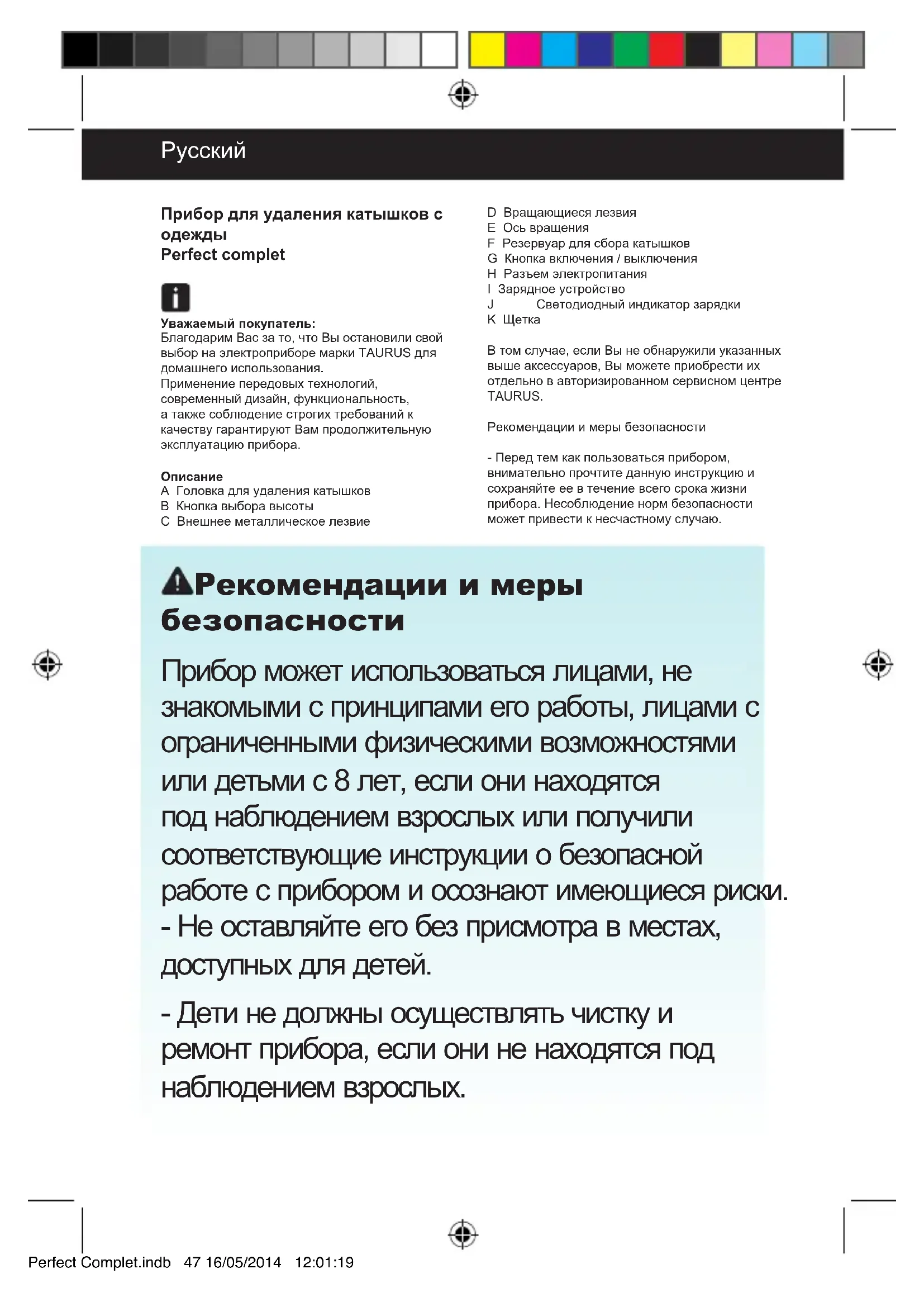 A Головка для удаления катышков B Кнопка выбора высоты C Внешнее металлическое лезвие D Вращающиеся лезвия E Ось вращения F Резервуар для сбора катышков G Кнопка включения / выключения H Разъем электропитания I Зарядное устройство J Светодиодный индикатор зарядки K Щетка В том случае, если Вы не обнаружили указанных выше аксессуаров, Вы можете приобрести их отдельно в авторизированном сервисном центре TAURUS. Рекомендации и меры безопасности - Перед тем как пользоваться прибором, внимательно прочтите данную инструкцию и сохраняйте ее в течение всего срока жизни прибора. Несоблюдение норм безопасности может привести к несчастному случаю. Perfect Complet.indb 47 16/05/2014 12:01:19- Используйте прибор исключительно с составными деталями и аксессуарами, которые поставляются в комплекте с прибором. - Если Вы заметили неисправности в работе прибора, обратитесь в авторизированный сервисный центр. Не пытайтесь починить прибор самостоятельно, это может быть опасно. - Перед подключением прибора к электрической сети убедитесь, что напряжение в ней соответствует напряжению, указанному на корпусе. - Убедитесь, что розетка имеет надежное заземление и она рассчитана не менее чем на 10А. - Вилка электропитания должна соответствовать стандарту розеток, который используется в вашем регионе. Не рекомендуется использовать адаптеры и изменять штыковой контакт. - Возьмитесь рукой за вилку и аккуратно выньте ее, придерживая розетку другой рукой. Не поднимайте и не перемещайте прибор за шнур электропитания. - Не закручивайте шнур электропитания вокруг