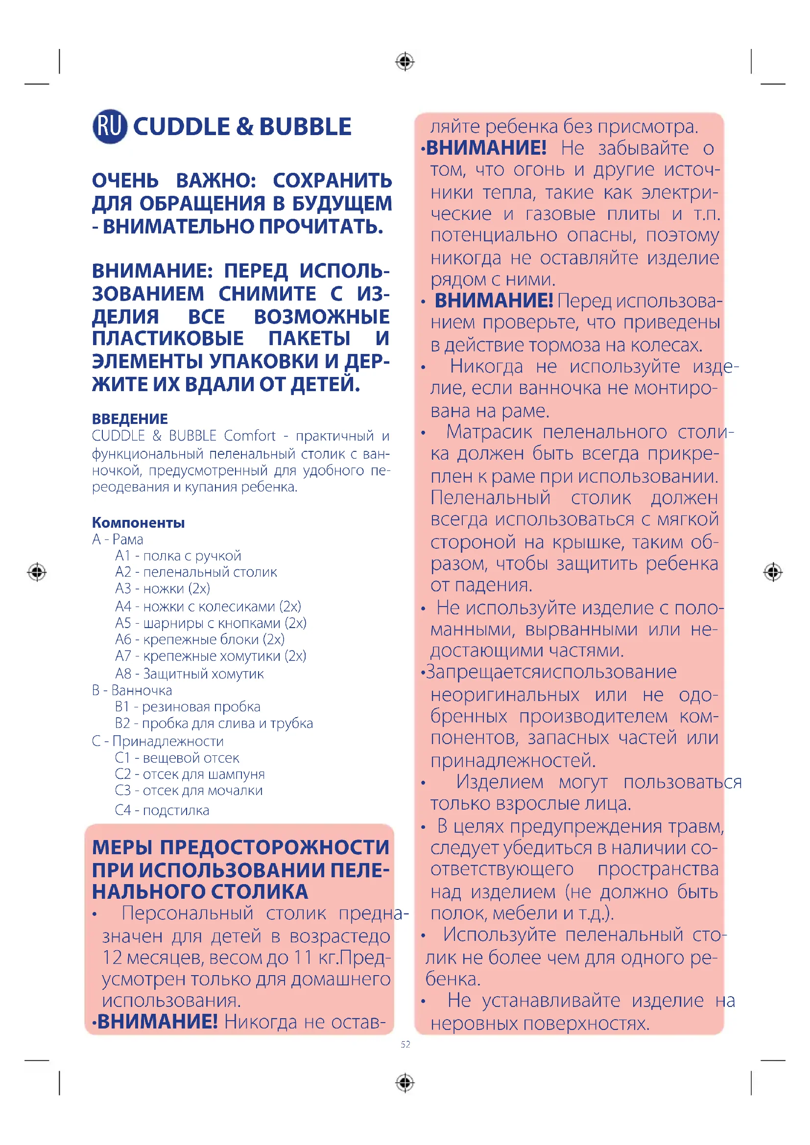 A - Рама A1 - полка с ручкой A2 - пеленальный столик A3 - ножки (2x) A4 - ножки с колесиками (2x) A5 - шарниры с кнопками (2x) A6 - крепежные блоки (2x) A7 - крепежные хомутики (2x) A8 - Защитный хомутик B - Ванночка B1 - резиновая пробка B2 - пробка для слива и трубка C - Принадлежности C1 - вещевой отсек C2 - отсек для шампуня C3 - отсек для мочалки C4 - подстилка МЕРЫ ПРЕДОСТОРОЖНОСТИ ПРИ ИСПОЛЬЗОВАНИИ ПЕЛЕ НАЛЬНОГО СТОЛИКА