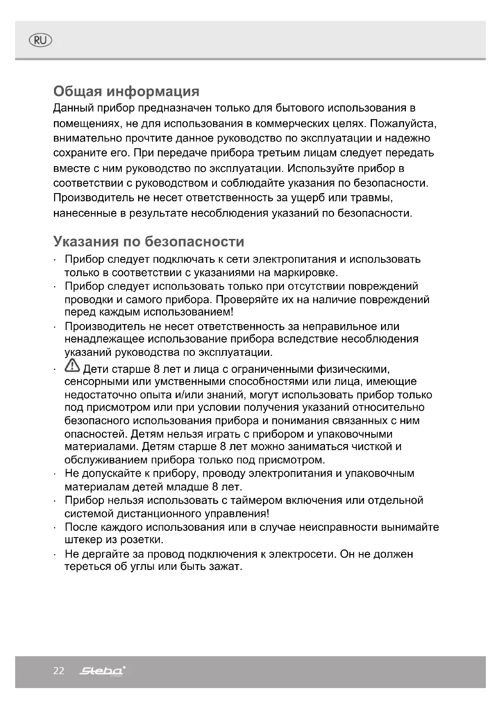 Дети старше 8 лет и лица с ограниченными физическими, сенсорными или умственными способностями или лица, имеющие недостаточно опыта и/или знаний, могут использовать прибор только под присмотром или при условии получения указаний относительно безопасного использования прибора и понимания связанных с ним опасностей. Детям нельзя играть с прибором и упаковочными материалами. Детям старше 8 лет можно заниматься чисткой и обслуживанием прибора только под присмотром. Не допускайте к прибору, проводу электропитания и упаковочным материалам детей младше 8 лет. Прибор нельзя использовать с таймером включения или отдельной системой дистанционного управления! После каждого использования или в случае неисправности вынимайте штекер из розетки. Не дергайте за провод подключения к электросети. Он не должен тереться об углы или быть зажат.23