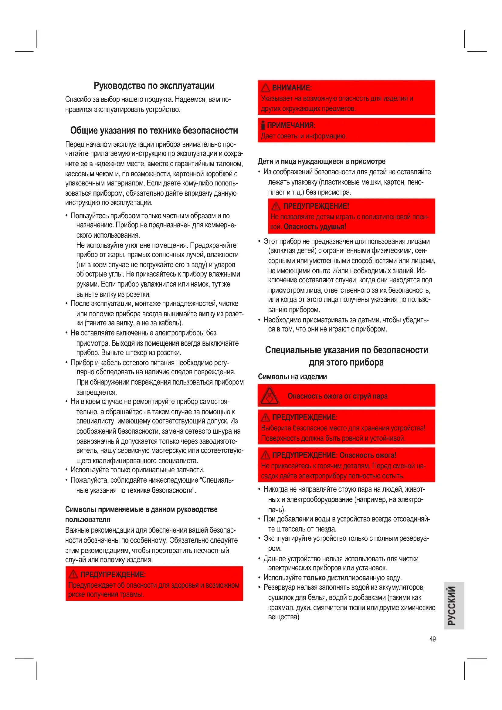 Важные рекомендации для обеспечения вашей безопас- ности обозначены по особенному. Обязательно следуйте этим рекомендациям, чтобы преотвратить несчастный случай или поломку изделия: