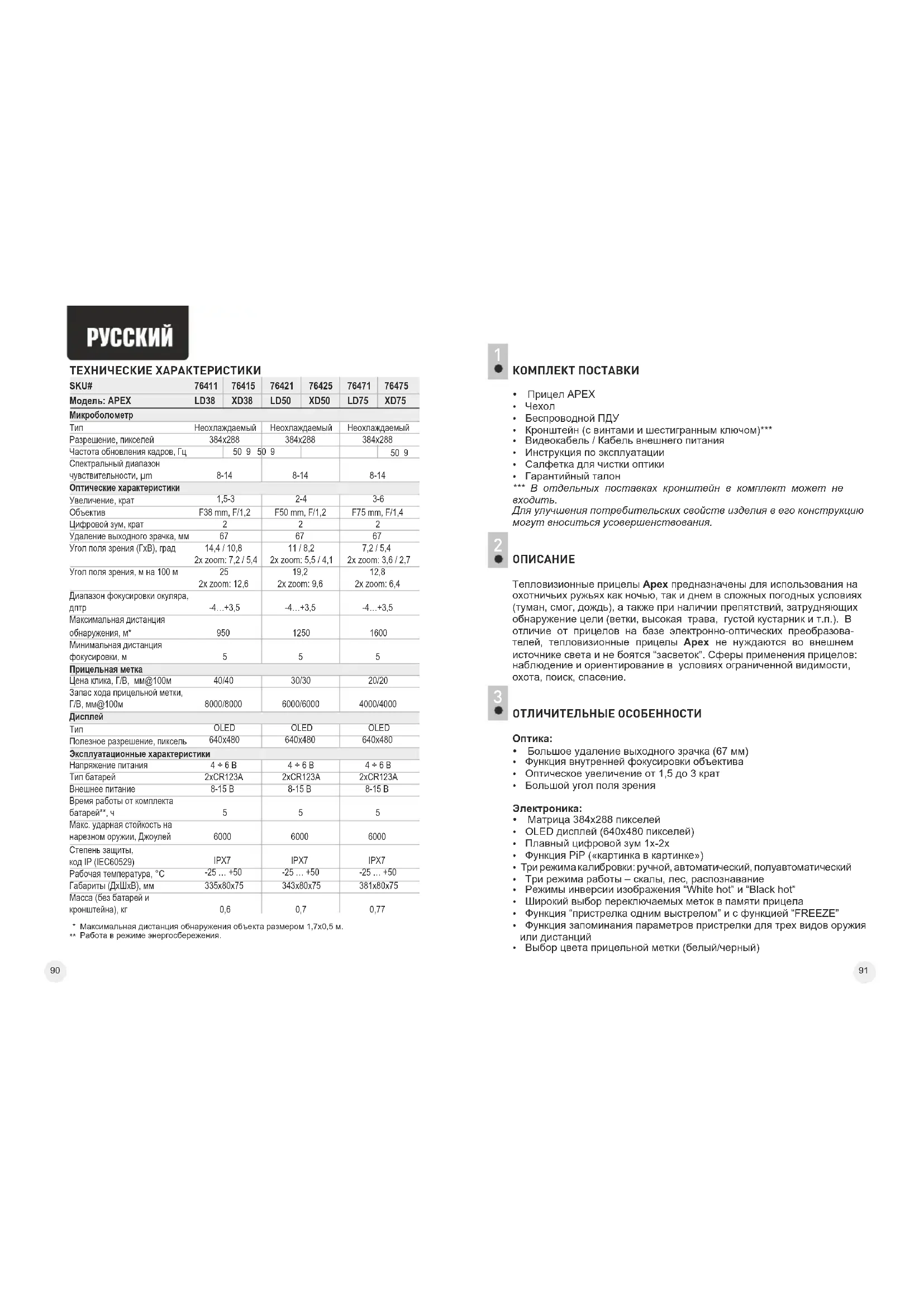 џ Большое удаление выходного зрачка (67 мм) џ Функция внутренней фокусировки объективаџ Оптическое увеличение от 1,5 до 3 крат џ Большой угол поля зрения Электроника: џ Матрица 384x288 пикселей џ OLED дисплей (640x480 пикселей) џ Плавный цифровой зум 1x-2x џ Функция PiP («картинка в картинке») џ Три режима калибровки: ручной, автоматический, полуавтоматический џ Три режима работы – скалы, лес, распознаваниеџ Режимы инверсии изображения “White hot” и “Black hot”џ Широкий выбор переключаемых меток в памяти прицелаџ Функция “пристрелка одним выстрелом” и с функцией “FREEZE”џ Функция запоминания параметров пристрелки для трех видов оружия или дистанций џ Выбор цвета прицельной метки (белый/черный)