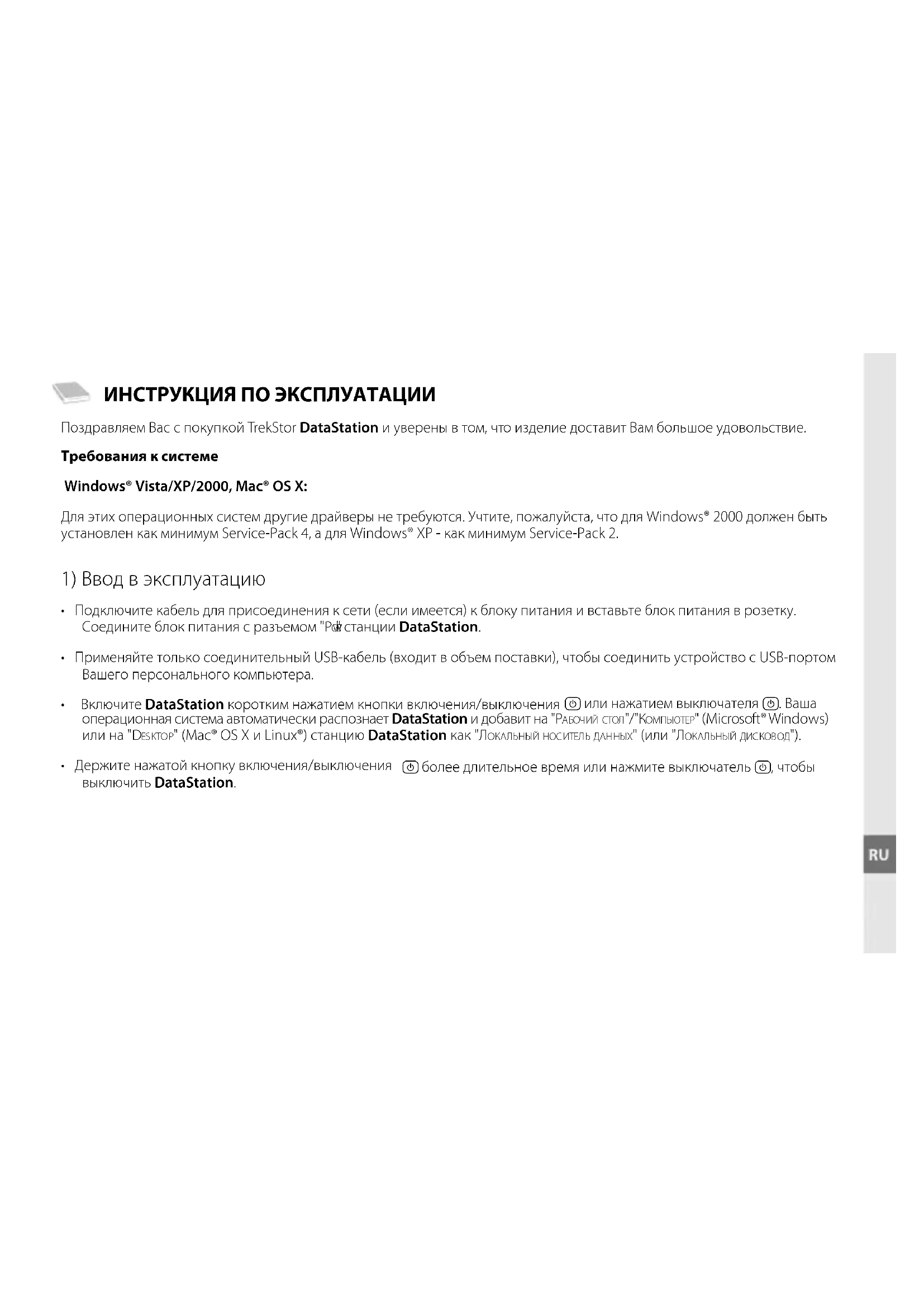 ИНСТРУКЦИЯ ПО ЭКСПЛУАТАЦИИ Поздравляем Вас с покупкой TrekStor DataStation и уверены в том, что изделие доставит Вам большое удовольствие. Требования к системе Windows® Vista/XP/2000, Mac® OS X: Для этих операционных систем другие драйверы не требуются. Учтите, пожалуйста, что для Windows® 2000 должен быть установлен как минимум Service-Pack 4, а для Windows® XP - как минимум Service-Pack 2.
