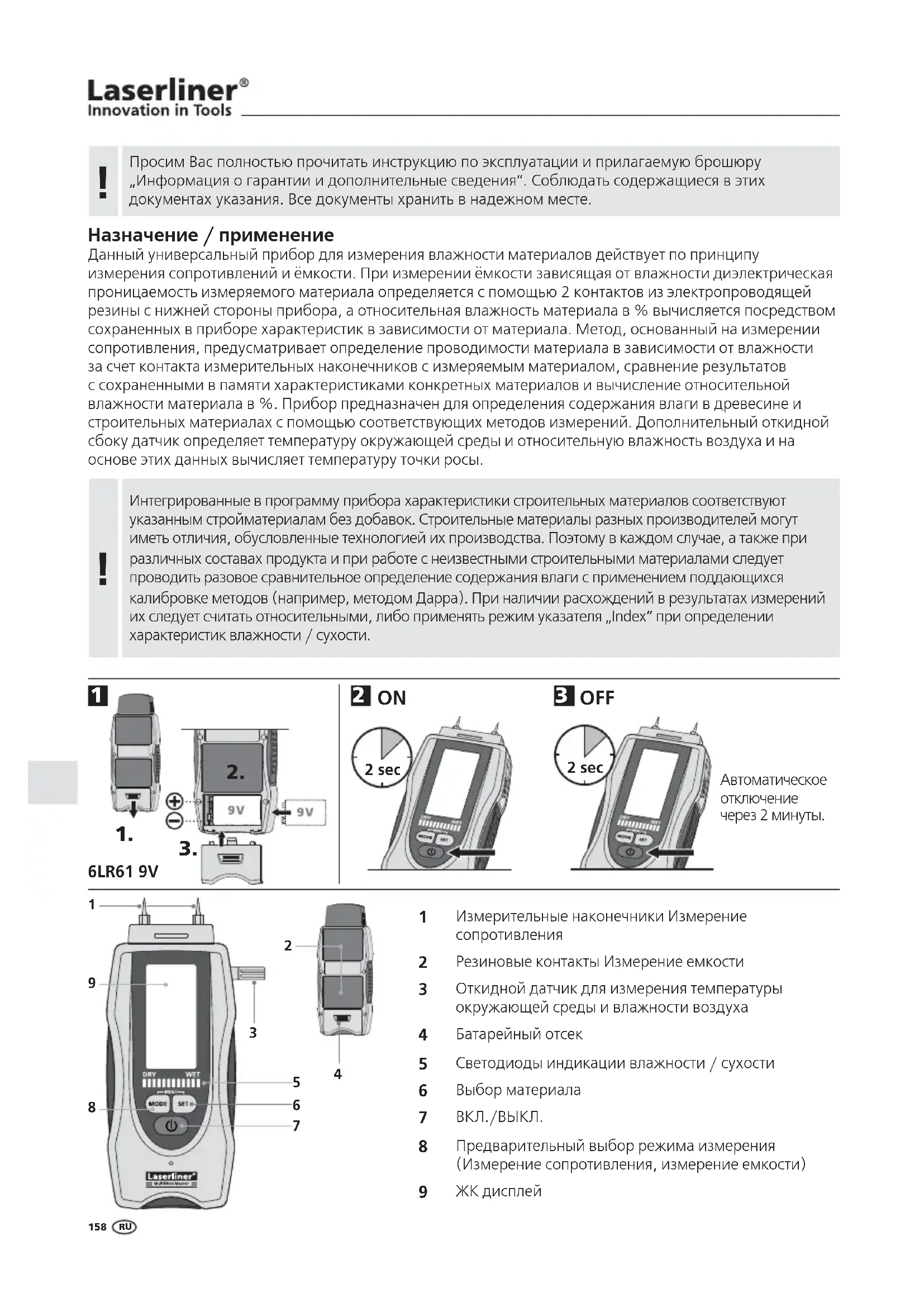 Назначение / применение Данный универсальный прибор для измерения влажности материалов действует по принципу измерения сопротивлений и ёмкости. При измерении ёмкости зависящая от влажности диэлектрическая проницаемость измеряемого материала определяется с помощью 2 контактов из электропроводящей резины с нижней стороны прибора, а относительная влажность материала в % вычисляется посредством сохраненных в приборе характеристик в зависимости от материала. Метод, основанный на измерении сопротивления, предусматривает определение проводимости материала в зависимости от влажности за счет контакта измерительных наконечников с измеряемым материалом, сравнение результатов с сохраненными в памяти характеристиками конкретных материалов и вычисление относительной влажности материала в %. Прибор предназначен для определения содержания влаги в древесине и строительных материалах с помощью соответствующих методов измерений. Дополнительный откидной сбоку датчик определяет температуру окружающей среды и относительную влажность воздуха и на основе этих данных вычисляет температуру точки росы.Просим Вас полностью прочитать инструкцию по эксплуатации и прилагаемую брошюру „Информация о гарантии и дополнительные сведения“. Соблюдать содержащиеся в этих документах указания. Все документы хранить в надежном месте. Автоматическое отключение через 2 минуты.Интегрированные в программу прибора характеристики строительных материалов соответствуют указанным стройматериалам без добавок. Строительные материалы разных производителей могут иметь отличия, обусловленные технологией их производства. Поэтому в каждом случае, а также при различных составах продукта и при работе с неизвестными строительными материалами следует проводить разовое сравнительное определение содержания влаги с применением поддающихся калибровке методов (например, методом Дарра). При наличии расхождений в результатах измерений их следует считать относительными, либо применять режим указателя „Index“ при определении характеристик влажности / сухости.