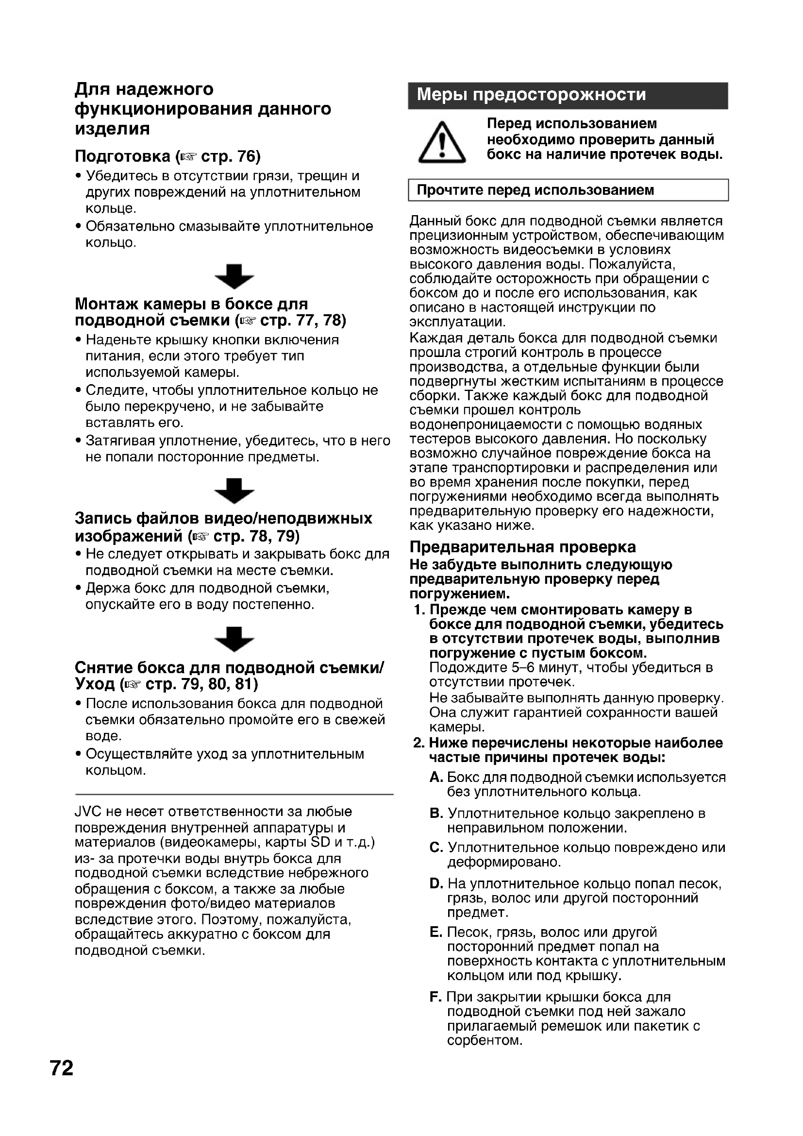 на наличие царапин и трещин при каждом использовании. При использовании бокс для подводной съемки противостоит давлению воды. Повторяющееся воздействие давления вызывает, в конечном итоге, усталость материала, которая может привести к повреждению бокса для подводной съемки. Проверяйте бокс для подводной съемки на наличие царапин и трещин при каждом использовании. Если бокс для подводной съемки используется часто, попросите выполнить его техобслуживании по месту покупки. (Техобслуживание является платным.) Для обеспечения сохранности камеры и оптимальной эффективности использования бокса для подводной съемки имейте в виду вышеперечисленные примеры. JVC не несет ответственности за протечки воды и повреждения чего-либо внутри бокса для подводной съемки (видеокамеры, карты SD и т.д.) вследствие небрежного обращения с данным изделием. При использовании бокса для подводной съемки обязательно следуйте предписанным процедурам.