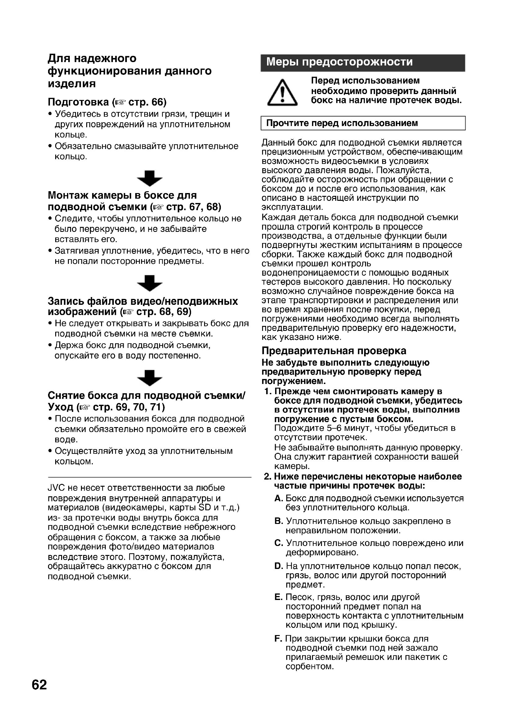 на наличие царапин и трещин при каждом использовании. При использовании бокс для подводной съемки противостоит давлению воды. Повторяющееся воздействие давления вызывает, в конечном итоге, усталость материала, которая может привести к повреждению бокса для подводной съемки. Проверяйте бокс для подводной съемки на наличие царапин и трещин при каждом использовании. Если бокс для подводной съемки используется часто, попросите выполнить его техобслуживании по месту покупки. (Техобслуживание является платным.) Для обеспечения сохранности камеры и оптимальной эффективности использования бокса для подводной съемки имейте в виду вышеперечисленные примеры. JVC не несет ответственности за протечки воды и повреждения чего-либо внутри бокса для подводной съемки (видеокамеры, карты SD и т.д.) вследствие небрежного обращения с данным изделием. При использовании бокса для подводной съемки обязательно следуйте предписанным процедурам.