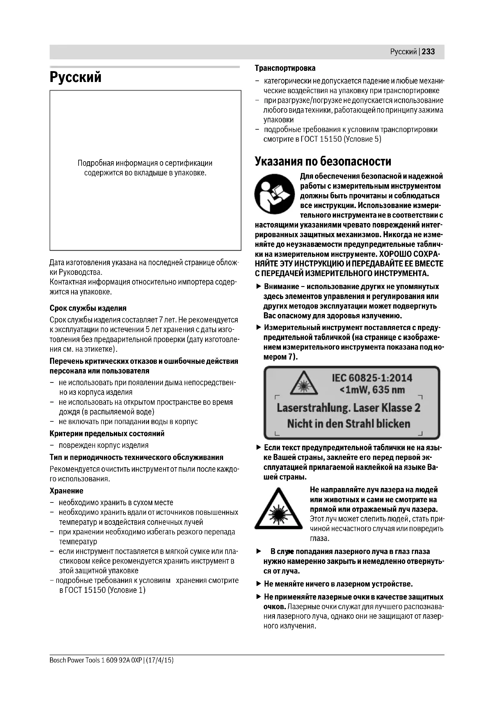 H36eRaTe CnIbHbIX TOUKOB HnaDEHn H3MEpHTenB-Horo HHCTpyMeHa. NocLe CnIbHbIX BHeuHnx BO3dEhCTBn Ha H3MEpHTeBHyB INCTpyMeHT, a TaKKe npH Heo-6bHuHom IOBeHnN erO fynKun, npExJe ueM npOdoJXaTb paBoTaB Cn3MEpHTeBHyIM HHCTpyMeHTOM, cNeDuET npOBepTb erO B aBTOpH3nPoBaHHoCepBnCHoMaCTepcko Bosch.