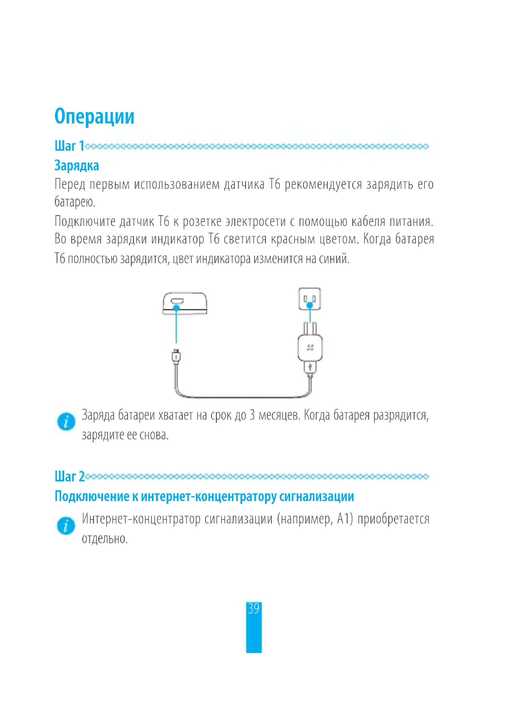 Подключите датчик T6 к розетке электросети с помощью кабеля питания. Во время зарядки индикатор T6 светится красным цветом. Когда батарея T6полностью зарядится, цвет индикатора изменится на синий. Заряда батареи хватает на срок до 3 месяцев. Когда батарея разрядится, зарядите ее снова. Шаг 2 Подключение к интернет-концентратору сигнализации Интернет-концентратор сигнализации (например, A1) приобретается отдельно.40