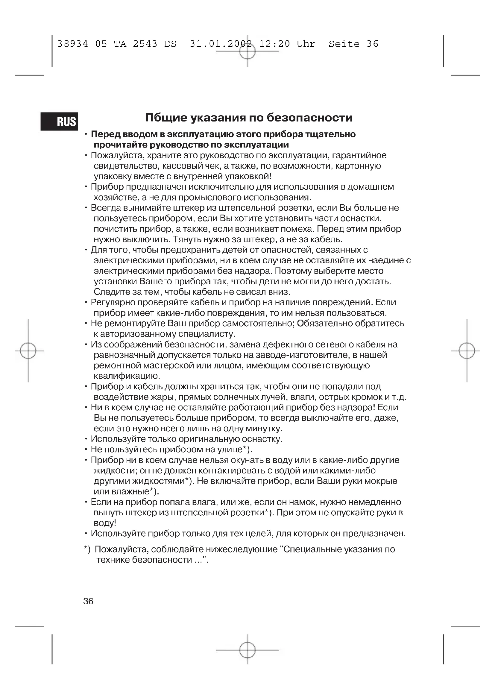 RUS 38934-05-TA 2543 DS 31.01.2002 12:20 Uhr Seite 36Специальные указания по технике безопасности для этого прибора