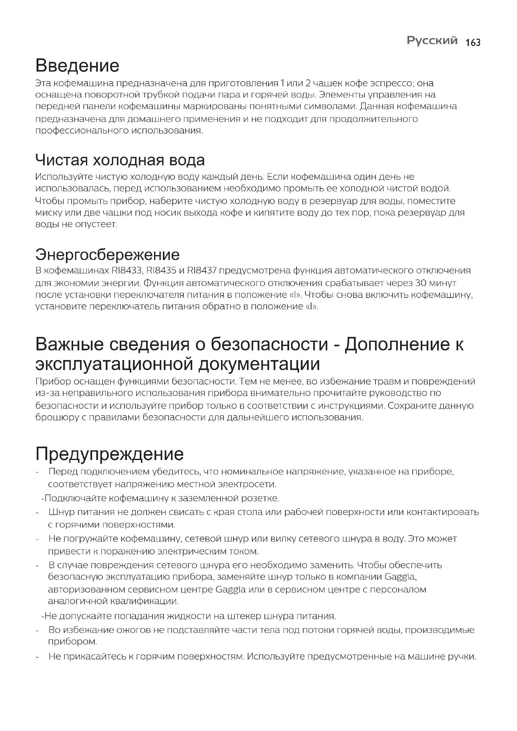 Эта кофемашина предназначена для приготовления 1 или 2 чашек кофе эспрессо; она оснащена поворотной трубкой подачи пара и горячей воды. Элементы управления на передней панели кофемашины маркированы понятными символами. Данная кофемашина предназначена для домашнего применения и не подходит для продолжительного профессионального использования. Чистая холодная вода Используйте чистую холодную воду каждый день. Если кофемашина один день не использовалась, перед использованием необходимо промыть ее холодной чистой водой. Чтобы промыть прибор, наберите чистую холодную воду в резервуар для воды, поместите миску или две чашки под носик выхода кофе и кипятите воду до тех пор, пока резервуар для воды не опустеет. Энергосбережение В кофемашинах RI8433, RI8435 и RI8437 предусмотрена функция автоматического отключения для экономии энергии. Функция автоматического отключения срабатывает через 30 минут после установки переключателя питания в положение «I». Чтобы снова включить кофемашину, установите переключатель питания обратно в положение «I». Важные сведения о безопасности - Дополнение к эксплуатационной документации Прибор оснащен функциями безопасности. Тем не менее, во избежание травм и повреждений из-за неправильного использования прибора внимательно прочитайте руководство по безопасности и используйте прибор только в соответствии с инструкциями. Сохраните данную брошюру с правилами безопасности для дальнейшего использования. Предупреждение - Перед подключением убедитесь, что номинальное напряжение, указанное на приборе, соответствует напряжению местной электросети. - Подключайте кофемашину к заземленной розетке. - Шнур питания не должен свисать с края стола или рабочей поверхности или контактировать с горячими поверхностями. - Не погружайте кофемашину, сетевой шнур или вилку сетевого шнура в воду. Это может привести к поражению электрическим током. - В случае повреждения сетевого шнура его необходимо заменить. Чтобы обеспечить безопасную эксплуатацию прибора, заменяйте шнур только в компании Gaggia, авторизованном сервисном центре Gaggia или в сервисном центре с персоналом аналогичной квалификации. - Не допускайте попадания жидкости на штекер шнура питания. - Во избежание ожогов не подставляйте части тела под потоки горячей воды, производимые - Не прикасайтесь к горячим поверхностям. Используйте предусмотренные на машине ручки.Pусский
