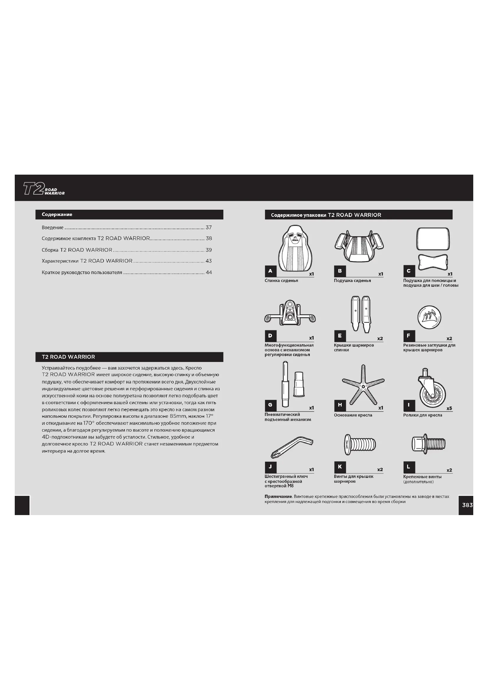 Содержимое упаковки T2 ROAD WARRIOR TROADWARRIOR Введение .............................................................................................................. Содержимое комплектаTROADWARRIOR ........................................... СборкаTROADWARRIOR ........................................................................ ХарактеристикиTROADWARRIOR ........................................................ Краткое руководство пользователя ................................................................ Устраивайтесь поудобнее— вам захочется задержаться здесь. Кресло T2 ROAD WARRIOR имеет широкое сидение, высокую спинку и объемную подушку, что обеспечивает комфорт на протяжении всего дня. Двухслойные индивидуальные цветовые решения и перфорированные сидения и спинка из искусственной кожи на основе полиуретана позволяют легко подобрать цвет в соответствии с оформлением вашей системы или установки, тогда как пять роликовых колес позволяют легко перемещать это кресло на самом разном напольном покрытии. Регулировка высоты в диапазоне 85mm, наклон 17° и откидывание на 170° обеспечивают максимально удобное положение при сидении, а благодаря регулируемым по высоте и положению вращающимся 4D-подлокотникам вы забудете об усталости. Стильное, удобное и долговечное кресло T2 ROAD WARRIOR станет незаменимым предметом интерьера на долгое время.