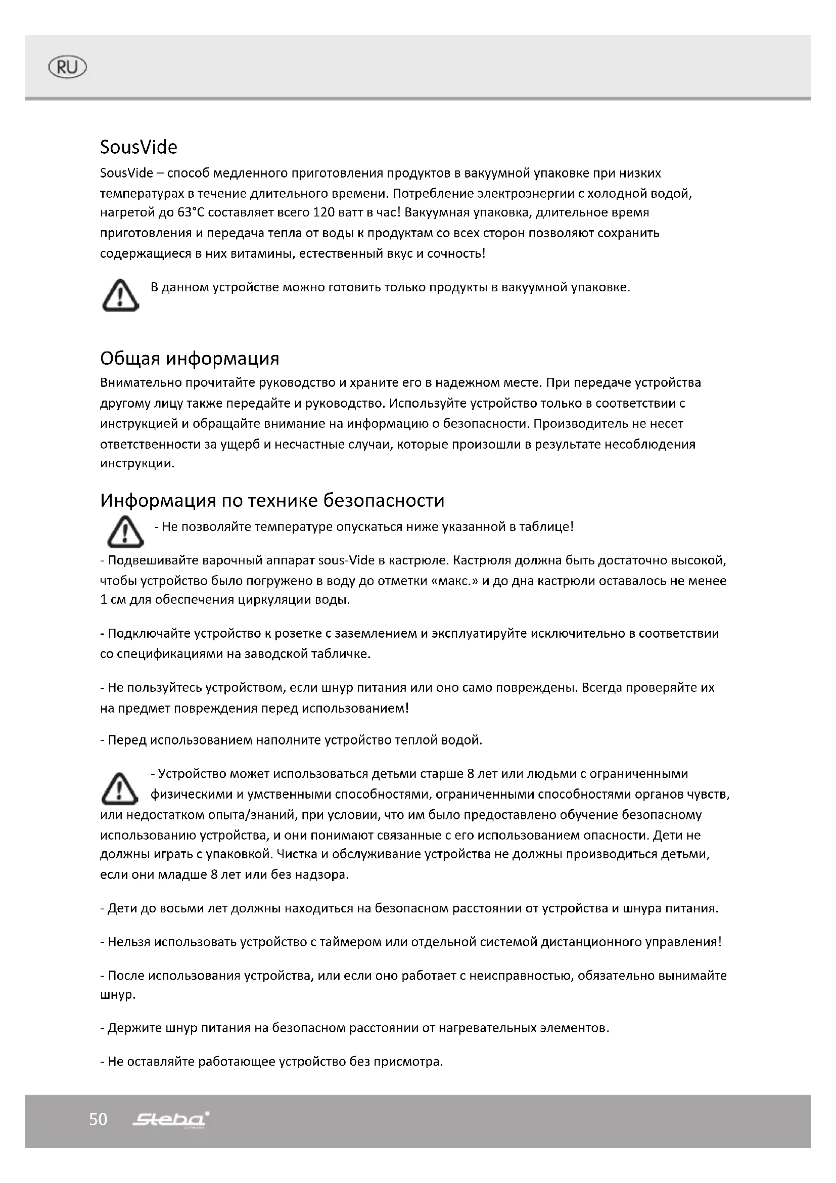 - нарезанные кубиками Не позволяйте температуре опуститься ниже указанной в таблице! Обратите внимание, что продолжительность приготовления, указанная в инструкции по эксплуатации и буклете с рецептами являются рекомендуемыми минимальными значениями времени, в течение которого продукты должны находиться в устройстве, когда оно уже было наполнено горячей (водопроводной) водой. При наполнении устройства холодной водой, время увеличивается приблизительно на 30 минут. Всегда наполняйте варочную установку, вместе с продуктами, водой до отметки «макс». Таким образом обеспечивается поддержание установленной температуры в варочном пространстве sous-vide 65°C с точностью +/- 0,5°C. Готовящиеся продукты можно положить в водяную баню непосредственно после заливки воды, и они могут оставаться в воде в течение времени, значительно превышающего указанное минимальное время без повышения требуемой базовой температуры выше установленной температуры, благодаря методу sous-vide. Совет от Steba Если вы укладываете несколько вакуумных упаковок с различным временем приготовления и количеством мяса, вам следует заранее их пометить. При температуре 62°C вы можете оставить мясо в чаше и вынуть его при необходимости, без изменения консистенции мяса. Дальнейшая обработка Длительное хранение: Остудите мясо в воде со льдом немедленно после приготовления. После этого мясо может храниться в холодильнике в течение нескольких дней (температура в холодильнике 7°C = 5 дней, температура в холодильнике 5°C = 10 дней) без потери качества, или заморозить в морозильном отделении. Для размораживания, поместите продукты в вакуумной упаковке в устройство при температуре примерно 55°C и разморозьте его в пакете. После этого выньте продукты из пакета, и немедленно употребите, либо быстро обжарьте. Немедленное употребление в пищу: Разумеется, мясо можно употреблять в пищу непосредственно после приготовления методом Sous-Vide, или обжарить с каждой стороны в течение не более 1 минуты с каждой стороны на очень горячей сковороде с небольшим количеством растительного56 SousVide SousVide è un metodo per cuocere sottovuoto gli alimenti a bassa temperatura per lungo tempo. Il consumo energetico in acqua fredda riscaldata a 63°C e di circa 120 Watt/ora! Grazie al sottovuoto, alla cottura lenta e al calore omogeneo dell'acqua attorno agli alimenti, i sali minerali, il sapore e i succhi non si disperdono! Riscaldare solo alimenti sottovuoto con questo dispositivo. Sigillare bene il sacchetto! In generale Leggere attentamente le istruzioni prima di mettere in funzione il dispositivo e conservare con cura. Se si cede il dispositivo a terzi, consegnare anche il presente manuale. Utilizzare secondo l'uso previsto e seguire le avvertenze di sicurezza. S i decina qualsiasi responsabilità per danni o lesioni causati da un uso improprio. Istruzioni di sicurezza