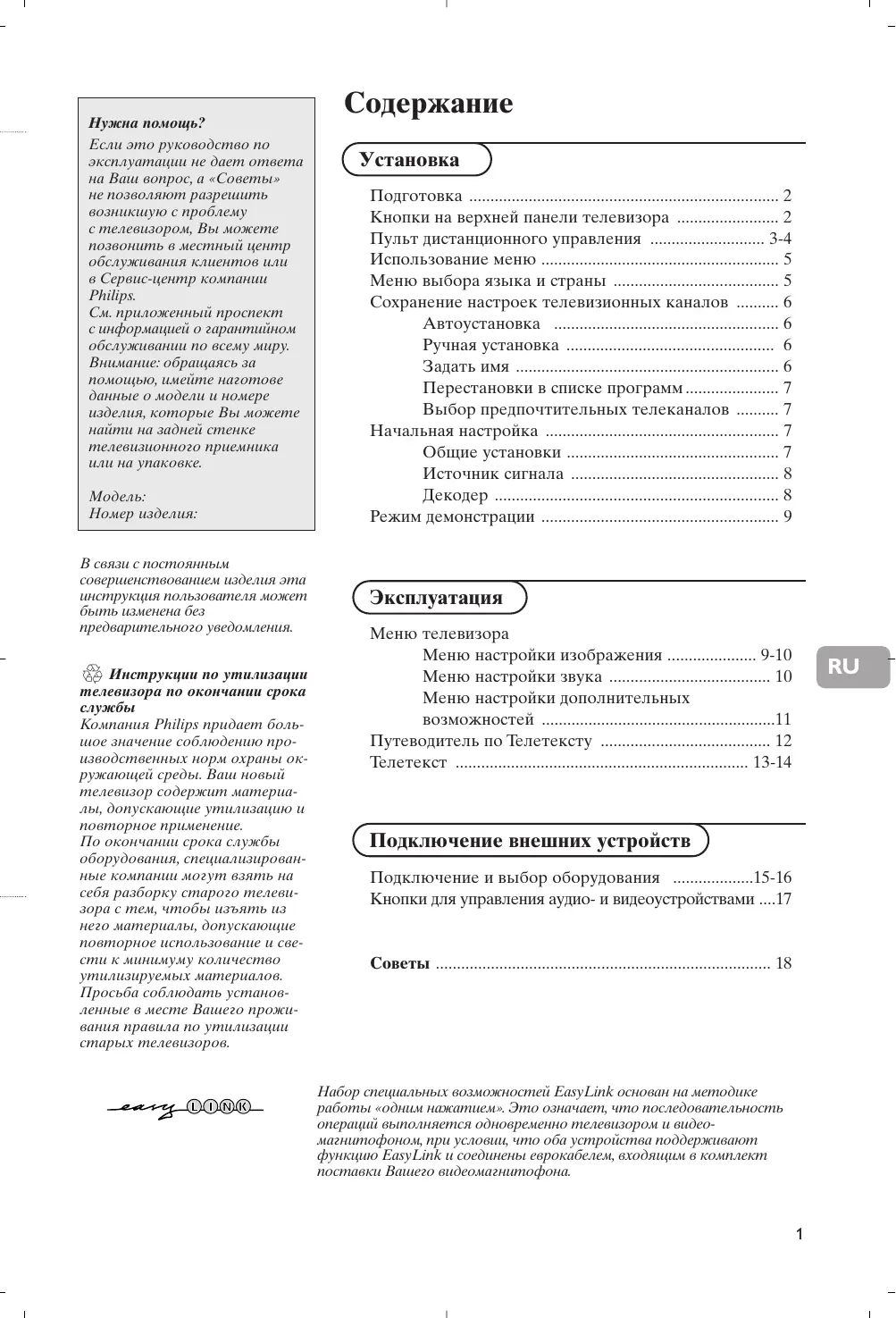 ËÁ‰ÂÎËÈ, ËÒÔÓθÁÛÂÏ˚ı ‰Îfl ΢Ì˚ı ·˚ÚÓ‚˚ı ÌÛʉ, Ë Ì ‡ÒÔÓÒÚ‡ÌflÂÚÒfl ̇ ËÁ‰ÂÎËfl, ÍÓÚÓ˚ ËÒÔÓθÁÛ˛ÚÒfl ‰Îfl ÍÓÏϘÂÒÍËı, ÔÓÏ˚¯ÎÂÌÌ˚ı ËÎË ÔÓÙÂÒÒËÓ̇θÌ˚ı ˆÂÎÂÈ. èÓ ‚ÒÂÏ ‚ÓÔÓÒ‡Ï „‡‡ÌÚËÈÌÓ„Ó Ó·ÒÎÛÊË‚‡ÌËfl ËÁ‰ÂÎËÈ îËÎËÔÒ Ó·‡˘‡ÈÚÂÒ¸ Í Ç‡¯ÂÏÛ ÏÂÒÚÌÓÏÛ ÔÓ‰‡‚ˆÛ. îËχ îËÎËÔÒ ÛÒڇ̇‚ÎË‚‡ÂÚ ÒÎÂ‰Û˛˘Ë ÒÓÍË ÒÎÛÊ·˚ ËÁ‰ÂÎËfl: ÉÛÔÔ‡ 1–5 ÎÂÚ ê‡‰ËÓ, ‡‰ËÓ·Û‰ËθÌËÍË, χ„ÌËÚÓÎ˚, ÔÂÂÌÓÒÌ˚ χ„ÌËÚÓÎ˚, ÚÂÎÂÙÓÌÌ˚ ‡ÔÔ‡‡Ú˚ (ÔÓ‚Ó‰Ì˚Â) Ë ‰Û„‡fl ÔÓ‰Û͈Ëfl, Ëϲ˘‡fl Ì·Óθ¯Û˛ ÒÚÓËÏÓÒÚ¸. ÉÛÔÔ‡ 2–7 ÎÂÚ èÂÒÓ̇θÌ˚ ÍÓÏÔ¸˛ÚÂ˚ Ë ÔÂÂÙÂËÈÌ˚ ÛÒÚÓÈÒÚ‚‡, ˆ‚ÂÚÌ˚ ÚÂ΂ËÁÓ˚ (‚Íβ˜‡fl ÔÓÂ͈ËÓÌÌ˚Â), ‚ˉÂÓχ„ÌËÚÓÙÓÌ˚, ‡‚ÚÓÏÓ·ËθÌ˚ χ„ÌËÚÓÎ˚, Hi-Fi Á‚ÛÍÓ‚ÓÒÔÓËÁ‚Ó‰fl˘‡fl ‡ÔÔ‡‡ÚÛ‡ (‚Íβ˜‡fl ÍÓÏÔÓÌÂÌÚ˚), ‚ˉÂÓ͇ÏÂ˚ Ë ÔÂÂÌÓÒÌ˚ ‚ˉÂÓÛÒÚÓÈÒÚ‚‡, ‡‰ËÓÚÂÎÂÙÓÌ˚ (·ÂÒÔÓ‚Ó‰Ì˚Â), ˆËÙÓ‚˚ ÒÓÚÓ‚˚ ÚÂÎÂÙÓÌ˚ Ë ‡ÔÔ‡‡ÚÛ‡ Ë„Ó‚Ó„Ó Ì‡Á̇˜ÂÌËfl. îËχ îËÎËÔÒ Û‰ÂÎflÂÚ ·Óθ¯Ó ‚ÌËχÌË ͇˜ÂÒÚ‚Û ‚˚ÔÛÒ͇ÂÏÓÈ ÔÓ‰Û͈ËË. èË ËÒÔÓθÁÓ‚‡ÌËË Â ‰Îfl ΢Ì˚ı (·˚ÚÓ‚˚ı) ÌÛʉ Ò Òӷβ‰ÂÌËÂÏ Ô‡‚ËÎ ˝ÍÒÔÎÛ‡Ú‡ˆËË ÒÓÍ Ëı ÒÎÛÊ·˚ ÏÓÊÂÚ Á̇˜ËÚÂθÌÓ Ô‚˚ÒËÚ¸ ÓÙˈˇθÌ˚È ÒÓÍ ÒÎÛÊ·˚, ÛÒÚ‡ÌÓ‚ÎÂÌÌ˚È ‚ ÒÓÓÚ‚ÂÚÒÚ‚ËË Ò ‰ÂÈÒÚ‚Û˛˘ËÏ Á‡ÍÓÌÓ‰‡ÚÂθÒÚ‚ÓÏ Ó Ô‡‚‡ı ÔÓÚ·ËÚÂÎÂÈ. îËχ îËÎËÔÒ î‡ÍÒ: (095)755-69-23 Нужна помощь? Если это руководство по эксплуатации не дает ответа на Ваш вопрос, а «Советы» не позволяют разрешить возникшую с проблему с телевизором, Вы можете позвонить в местный центр обслуживания клиентов или в Сервис-центр компании Philips. См. приложенный проспект с информацией о гарантийном обслуживании по всему миру. Внимание: обращаясь за помощью, имейте наготове данные о модели и номере изделия, которые Вы можете найти на задней стенке телевизионного приемника или на упаковке. Номер изделия: В связи с постоянным совершенствованием изделия эта инструкция пользователя может быть изменена без предварительного уведомления. R Инструкции по утилизации телевизора по окончании срока Компания Philips придает большое значение соблюдению производственных норм охраны окружающей среды. Ваш новый телевизор содержит материалы, допускающие утилизацию и повторное применение. По окончании срока службы оборудования, специализированные компании могут взять на себя разборку старого телевизора с тем, чтобы изъять из него материалы, допускающие повторное использование и свести к минимуму количество утилизируемых материалов. Просьба соблюдать установленные в месте Вашего проживания правила по утилизации старых телевизоров.