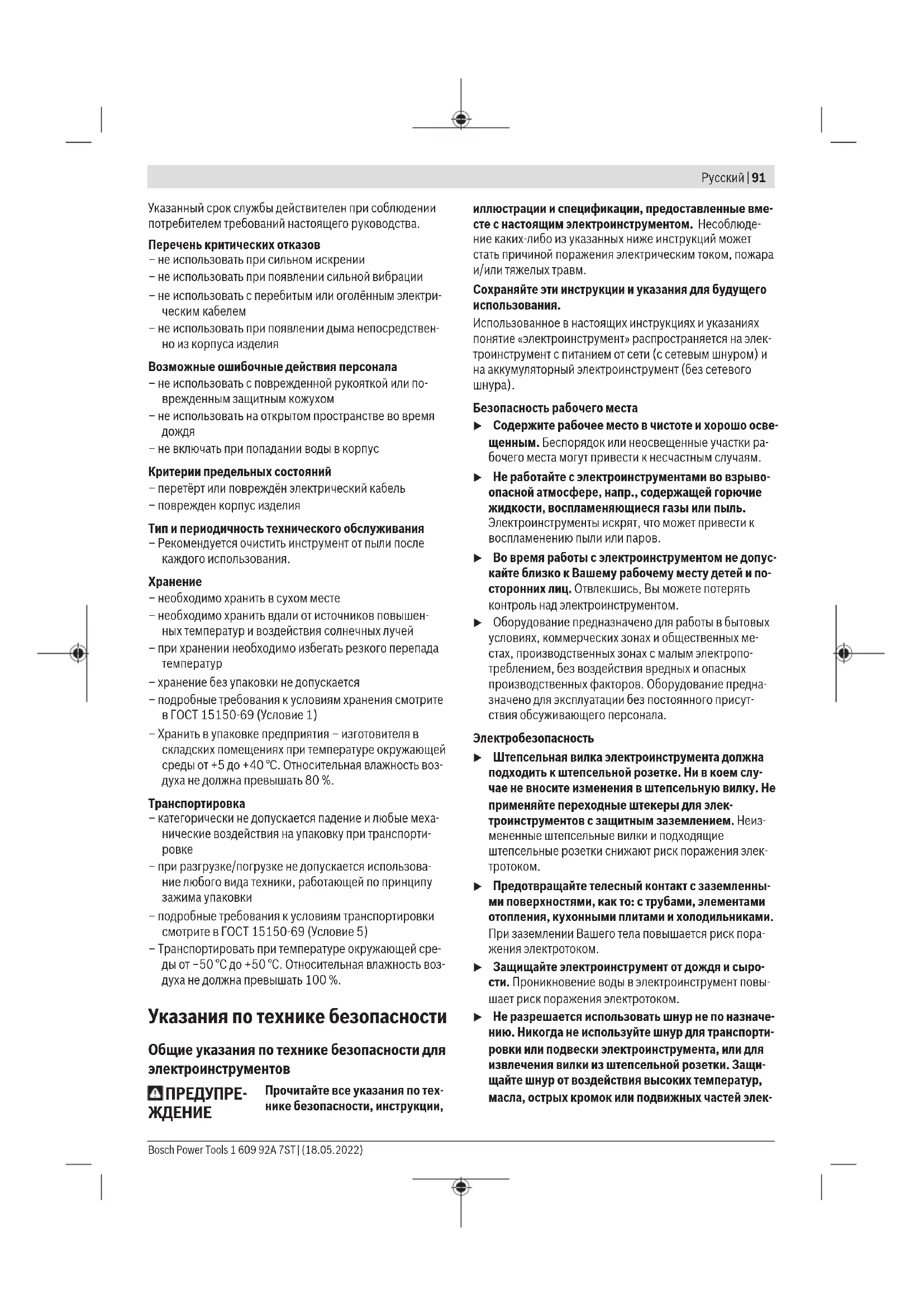 Toлько для стран Евразийского экономического союза (Таможенного союза) В состав эксплуатационных документов, предусмотрен- ных изготовителем для продукции, могут входить настоя- щее руководство по эксплуатации, а также приложения. Информация о подтверждении соответствия содержится в приложении. Информация о стране происхождения указана на корпу- се изделия и в приложении. Дата изготовления указана на последней странице об- ложки Руководства. Контактная информация относительно импортера содер- жится на упаковке. Срок службы изделия Срок службы изделия составляет 7 лет. Не рекомендует- ся к эксплуатации по истечении 5 лет хранения с даты изготовления без предварительной проверки (дату изго- товления см. на этикетке). 1 609 92A 7ST | (18.05.2022) Bosch Power ToolsРусский | 91 Указанный срок службы действителен при соблюдении потребителем требований настоящего руководства. Перечень критических отказов – не использовать при сильном искрении – не использовать при появлении сильной вибрации – не использовать с перебитым или оголённым электри- ческим кабелем – не использовать при появлении дыма непосредствен- но из корпуса изделия Возможные ошибочные действия персонала – не использовать с поврежденной рукояткой или по- врежденным защитным кожухом – не использовать на открытом пространстве во время
