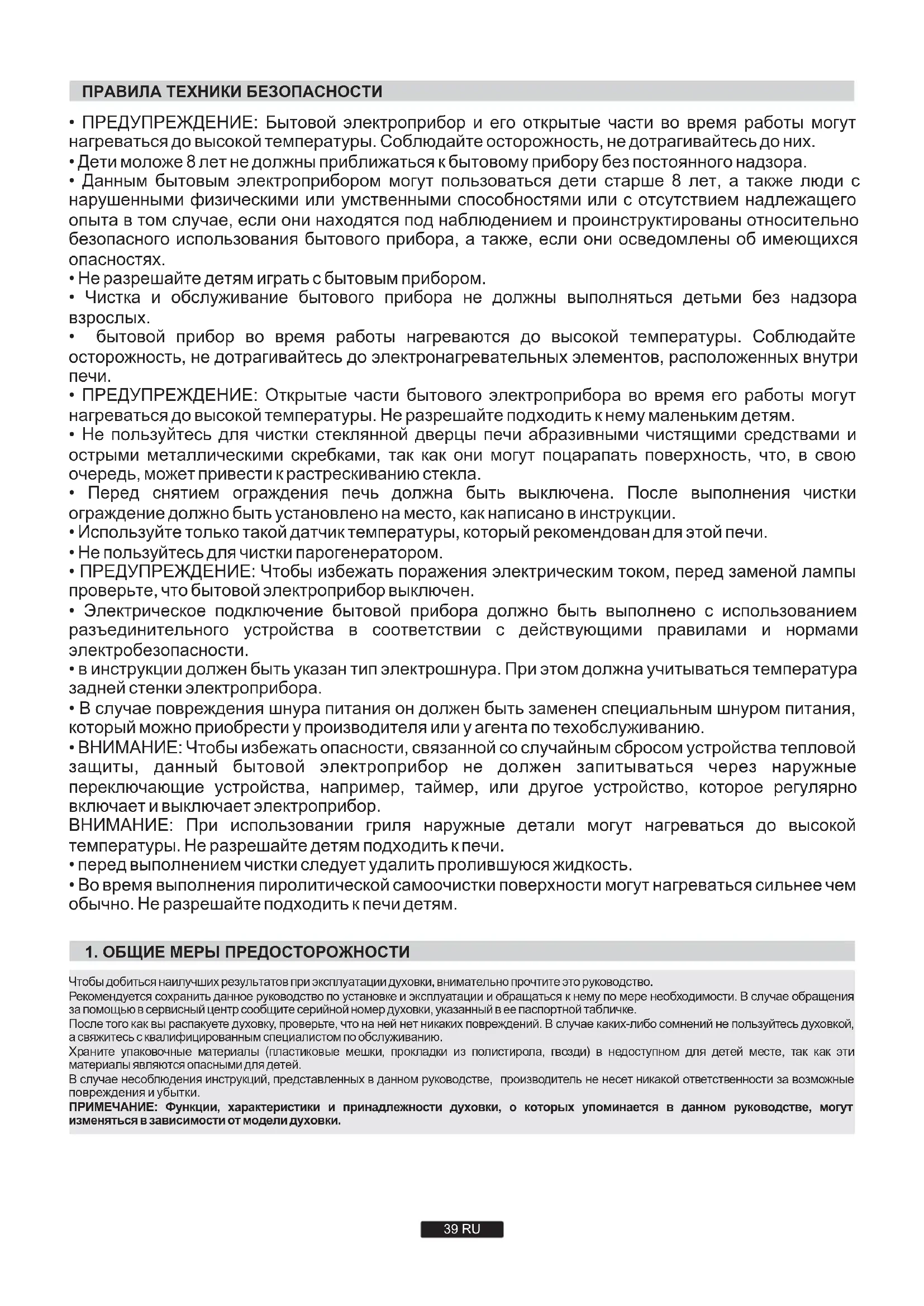 - ВНИМАНИЕ: Чтобы избежать опасности, связанной со случайным сбросом устройства тепловой защиты, данный бытовой электроприбор не должен запитываться через наружные переключающие устройства, например, таймер, или другое устройство, которое регулярно включает и выключает электроприбор. ВНИМАНИЕ: При использовании гриля наружные детали могут нагреваться до высокой температуры. Не разрешайте детям подходить к печи.