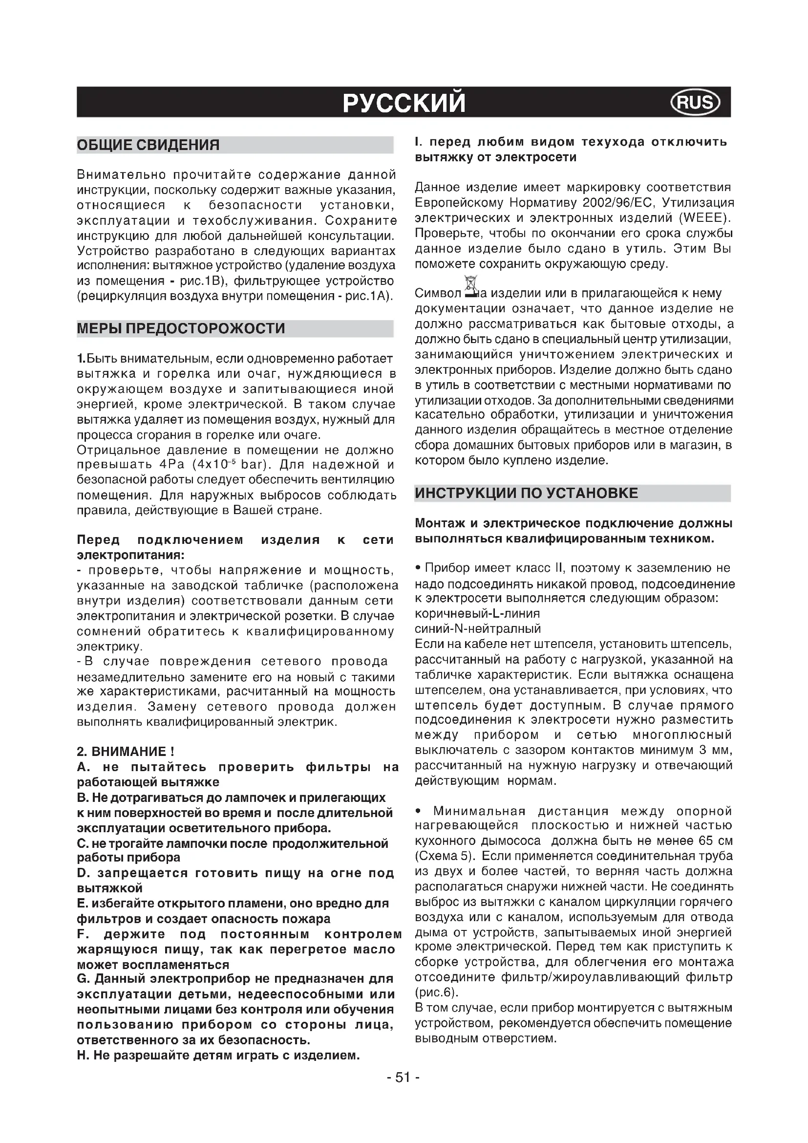 вытяжку от электросети Данное изделие имеет маркировку соответствия Европейскому Нормативу 2002/96/ЕС, Утилизация электрических и электронных изделий (WEEE). Проверьте, чтобы по окончании его срока службы данное изделие было сдано в утиль. Этим Вы поможете сохранить окружающую среду. Символ на изделии или в прилагающейся к нему документации означает, что данное изделие не должно рассматриваться как бытовые отходы, а должно быть сдано в специальный центр утилизации, занимающийся уничтожением электрических и электронных приборов. Изделие должно быть сдано в утиль в соответствии с местными нормативами по утилизации отходов. За дополнительными сведениями касательно обработки, утилизации и уничтожения данного изделия обращайтесь в местное отделение сбора домашних бытовых приборов или в магазин, в котором было куплено изделие. ИНСТРУКЦИИ ПО УСТАНОВКЕ Монтаж и электрическое подключение должны выполняться квалифицированным техником.