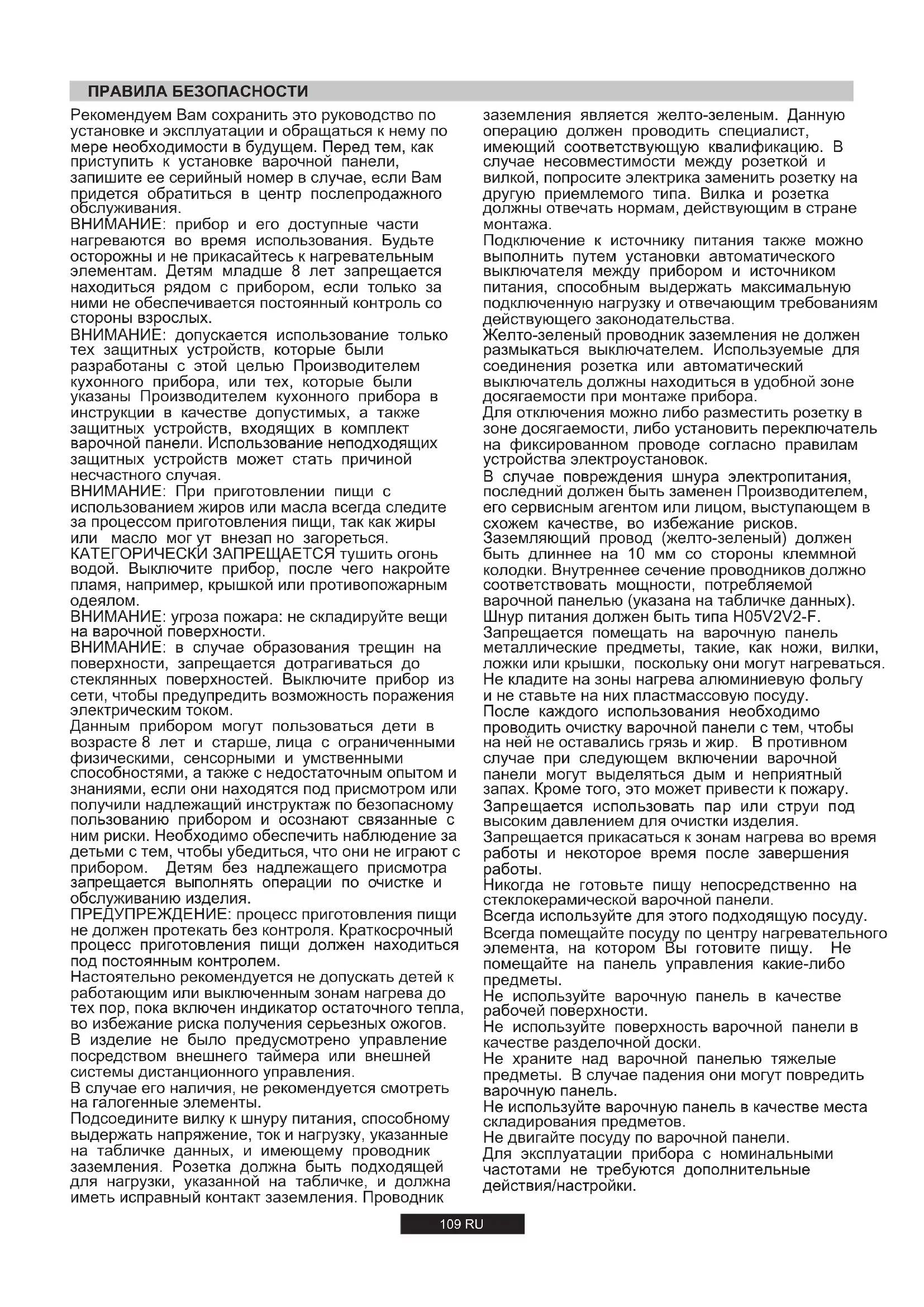 ВНИМАНИЕ: допускается использование только тех защитных устройств, которые были разработаны с этой целью Производителем кухонного прибора, или тех, которые были указаны Производителем кухонного прибора в инструкции в качестве допустимых, а также защитных устройств, входящих в комплект варочной панели. Использование неподходящих защитных устройств может стать причиной несчастного случая.